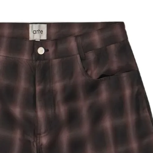 черно-коричневый клетчатый узор, панельный дизайн, застегивается на пуговицы спереди, прорезные карманы
