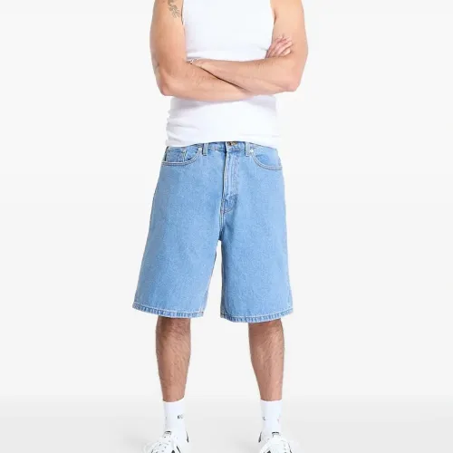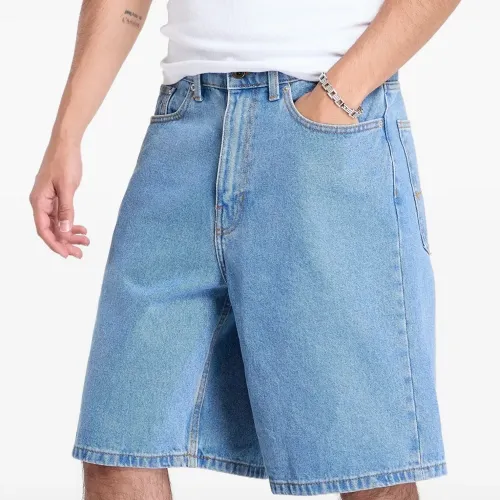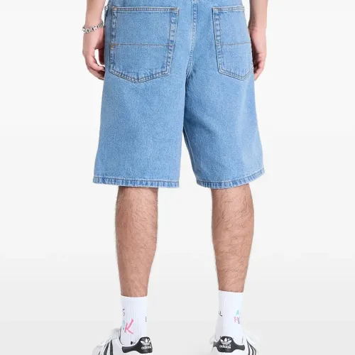 синие шлевки для ремня, пять карманов, потайная застежка и застежка на пуговицу