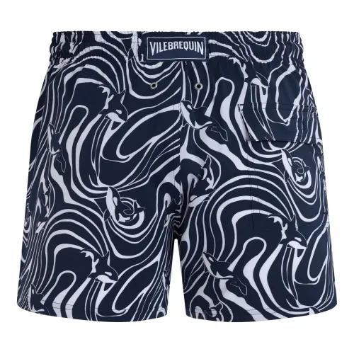темно-синий эластичный пояс, завязки, боковые карманы, задний карман, принт с косатками. Пожалуйста, примерьте купальник поверх собственной одежды.