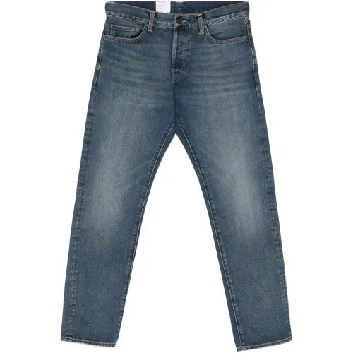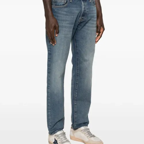 синие джинсы с застёжкой на пуговицы, шлёвками для ремня и классическими пятью карманами