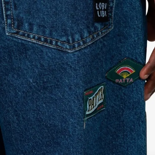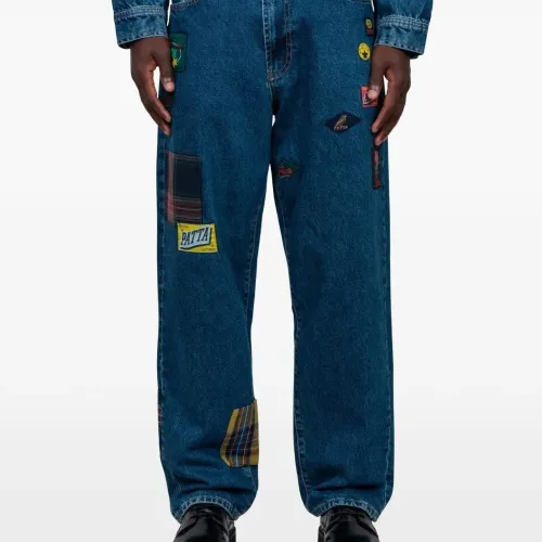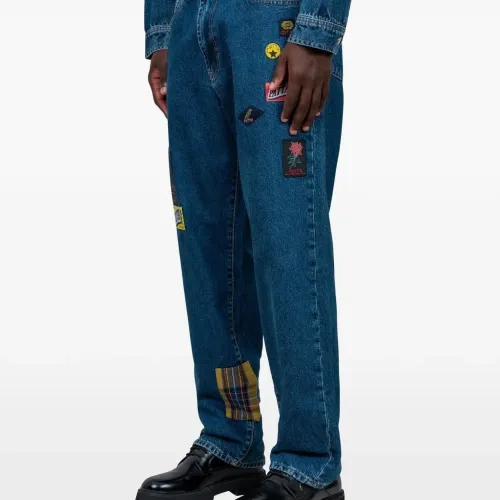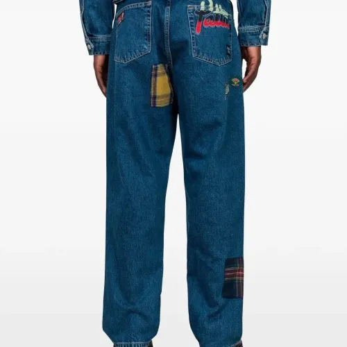 синий лоскутный дизайн, пять карманов, вышивка с логотипом, шлевки для ремня