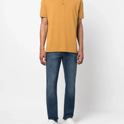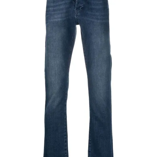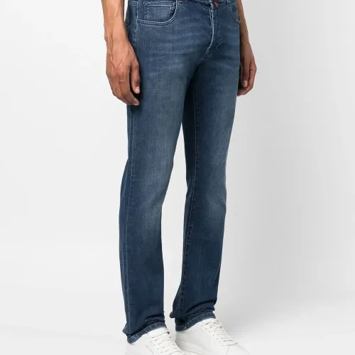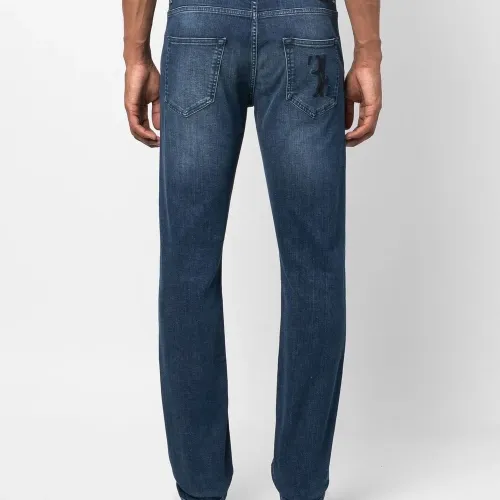 Синий, эластичный хлопок, вышитый логотип сзади, средняя посадка, петли для ремня, ширинка на пуговицах, пять карманов, нашивка с логотипом сзади и прямой крой.