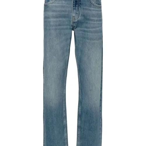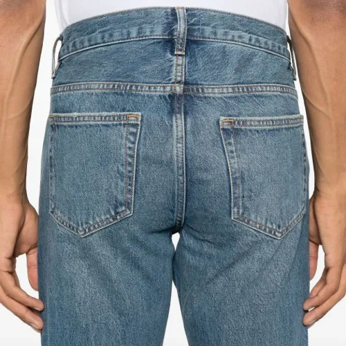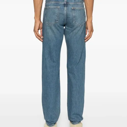 синий джинсы с эффектом потертости, классический дизайн с пятью карманами, застежка на пуговицы, прямые брючины, средняя посадка