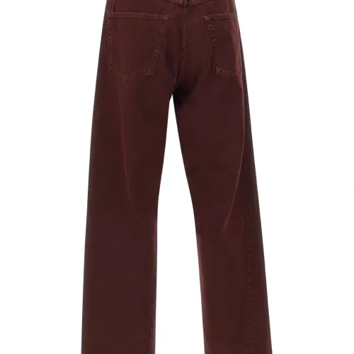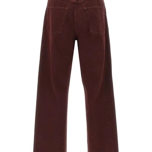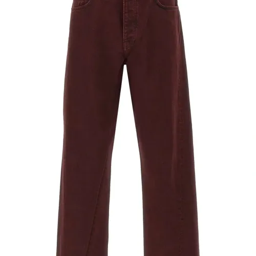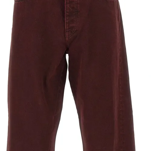 амарантово-красный, конструкция с пятью карманами, скрученные боковые швы, потайная застежка на пуговицах, кожаная нашивка с логотипом