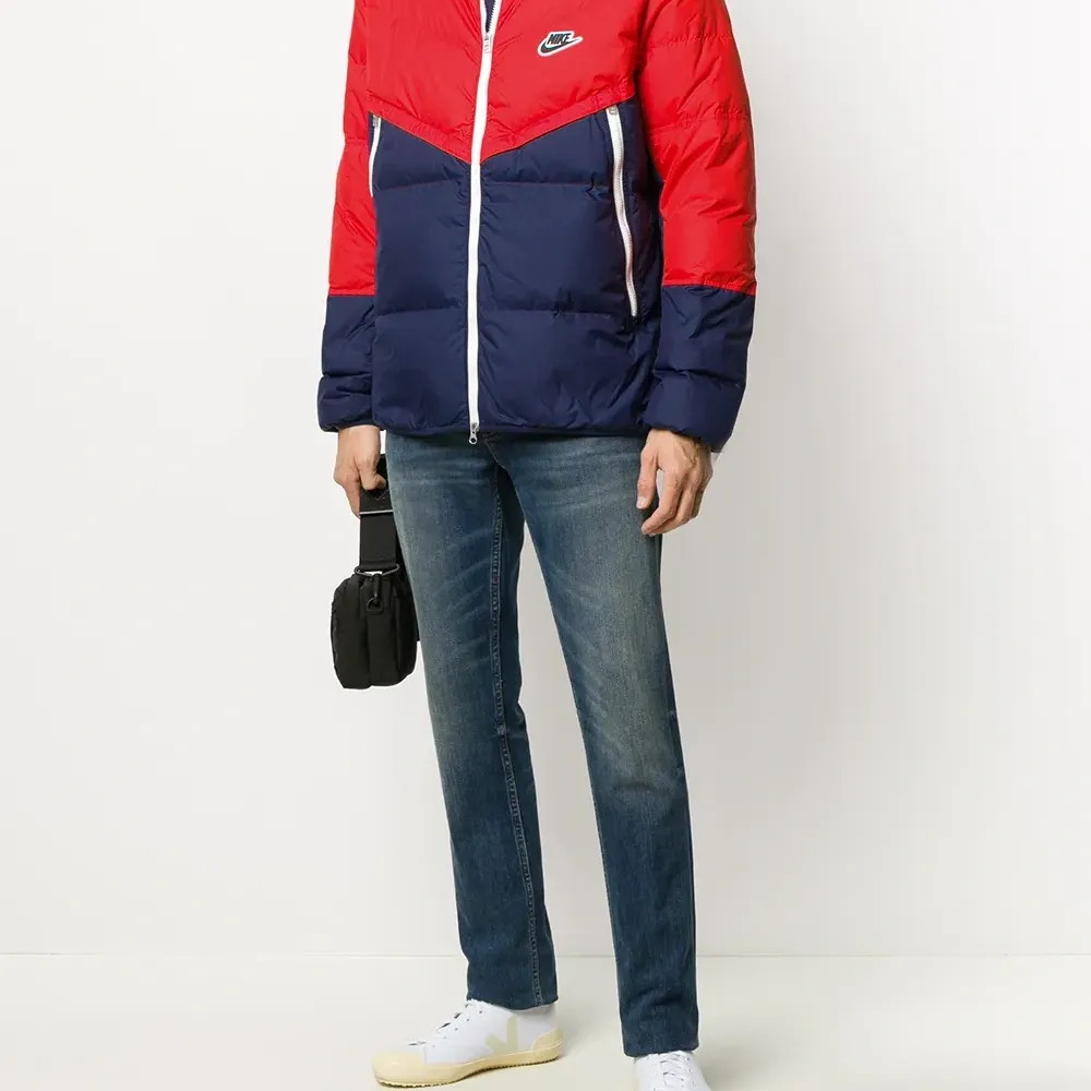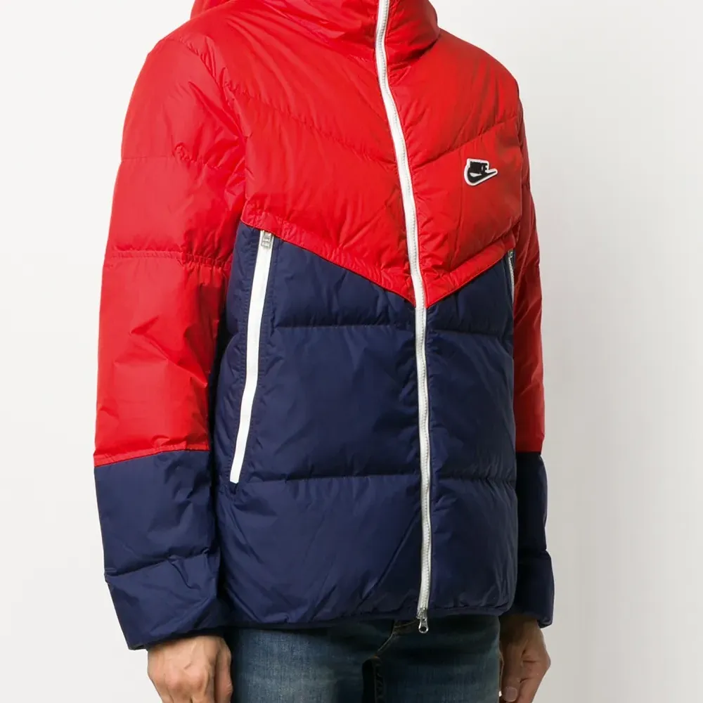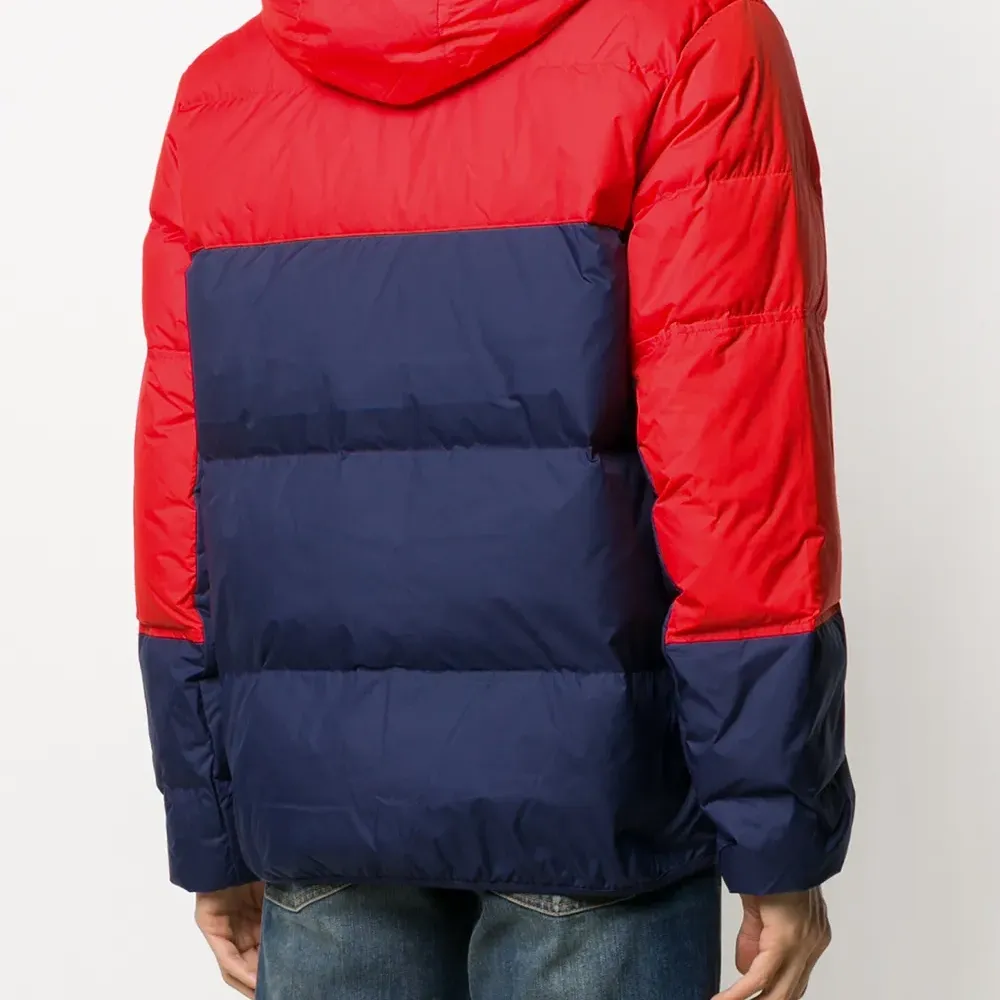 Нашивка с логотипом спереди, дутый материал, стеганая отделка, длинные рукава, классический капюшон, застежка на молнии спереди и передние карманы на молнии.