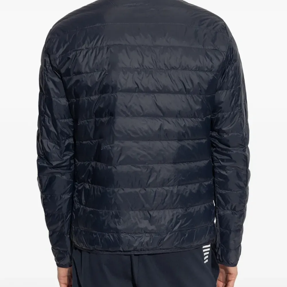 темно-синий стеганый дизайн, застежка-молния, круглый вырез, принт с логотипом, стойка-воротник