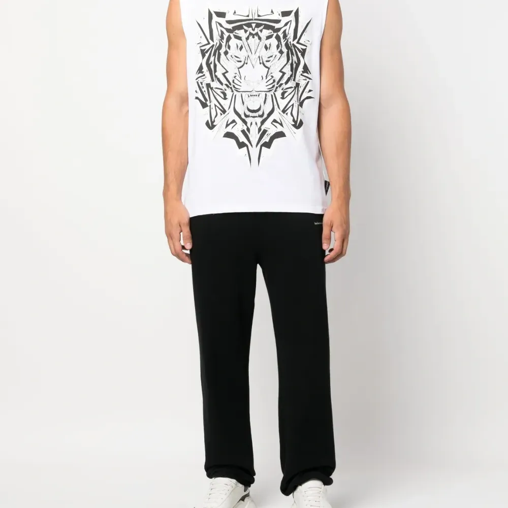 Белый, хлопок, принт с изображением тигра, нашивка с логотипом сзади, без рукавов, круглый вырез и прямой подол.