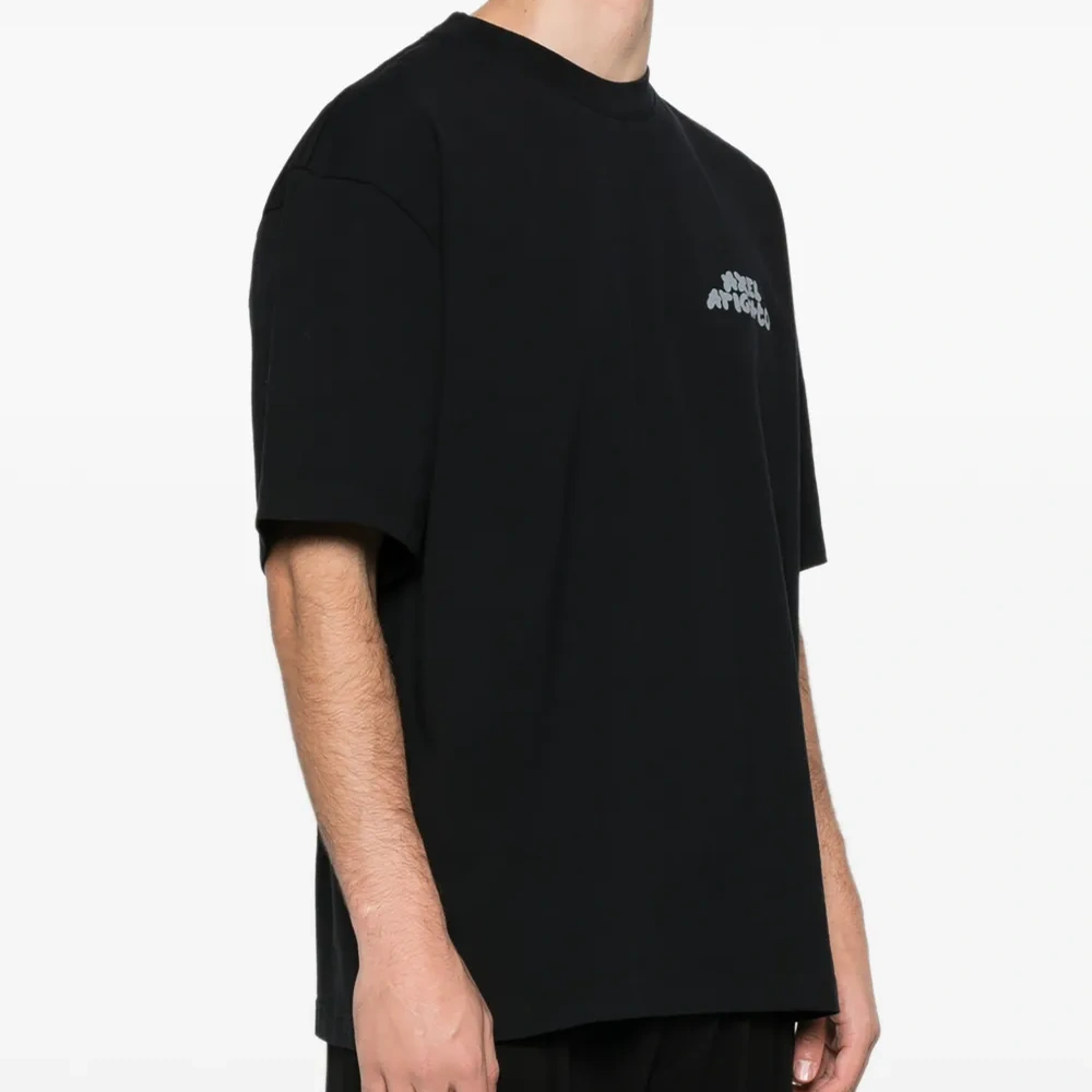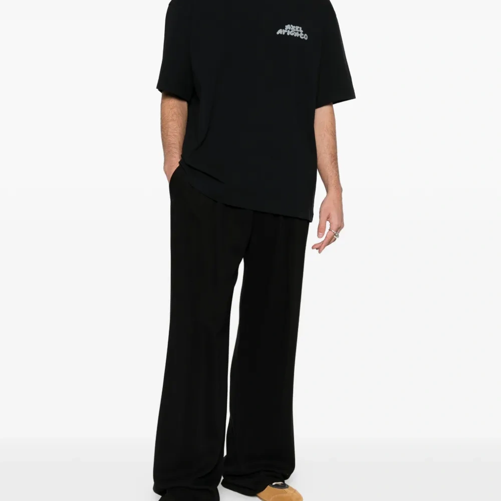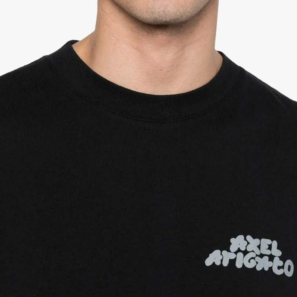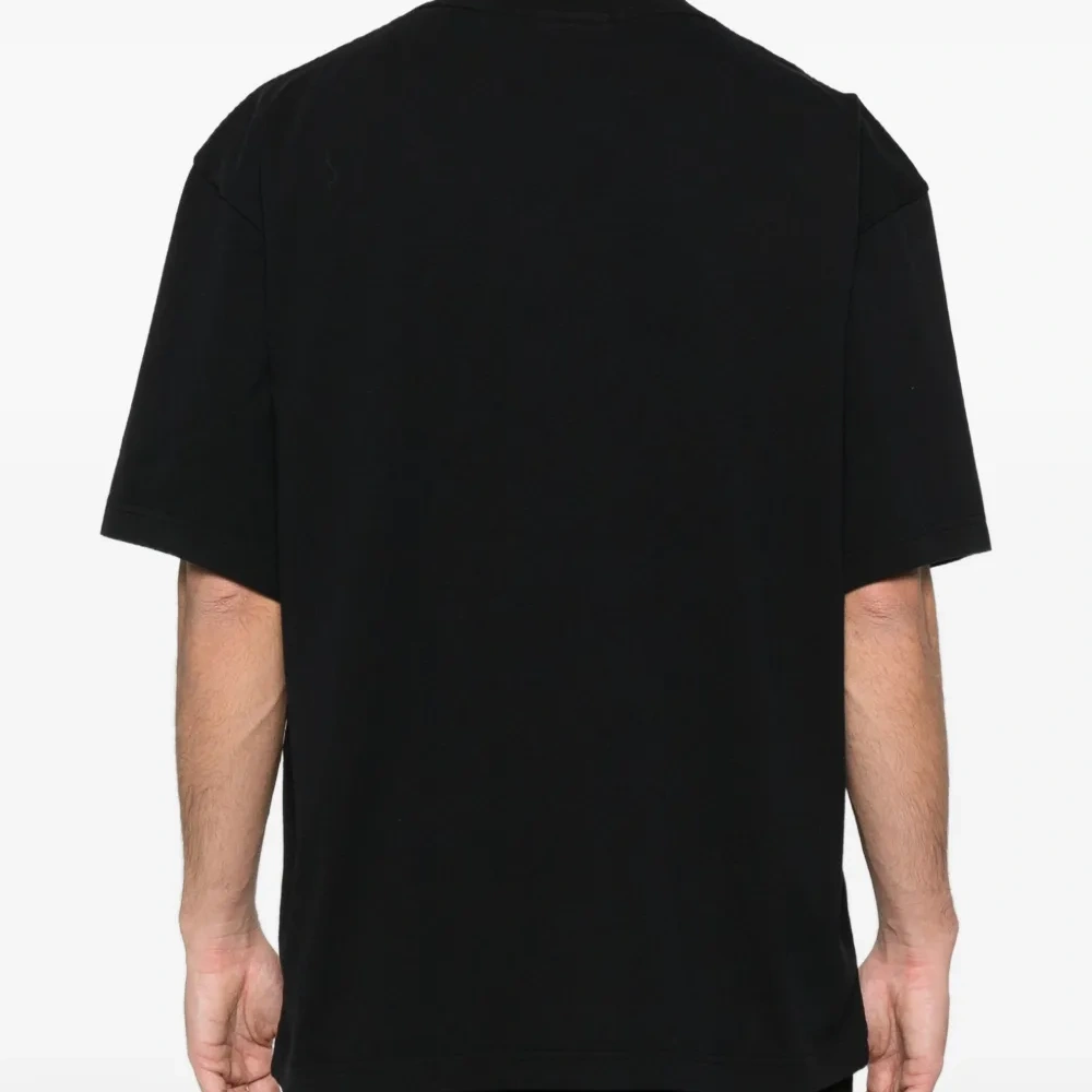чёрная футболка с логотипом, круглый вырез, короткие рукава, прямой низ