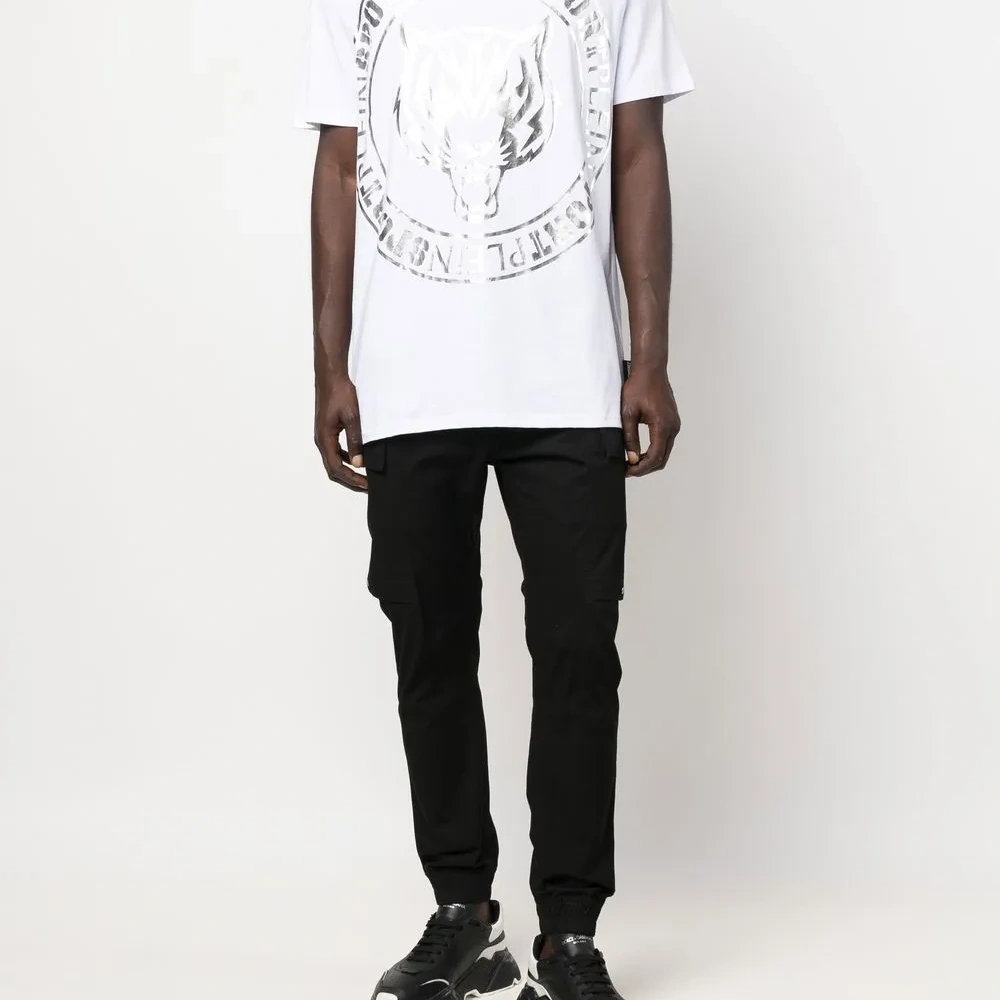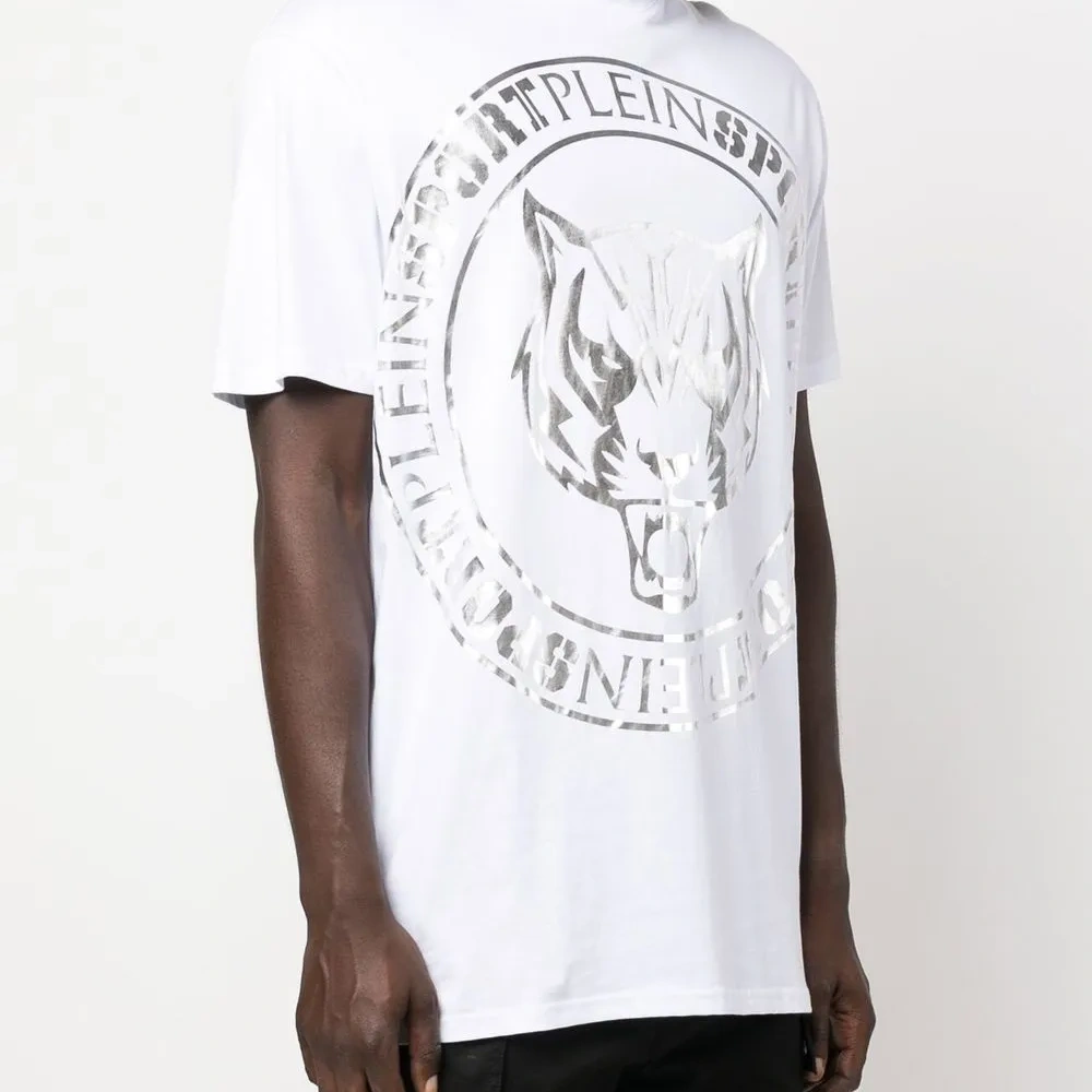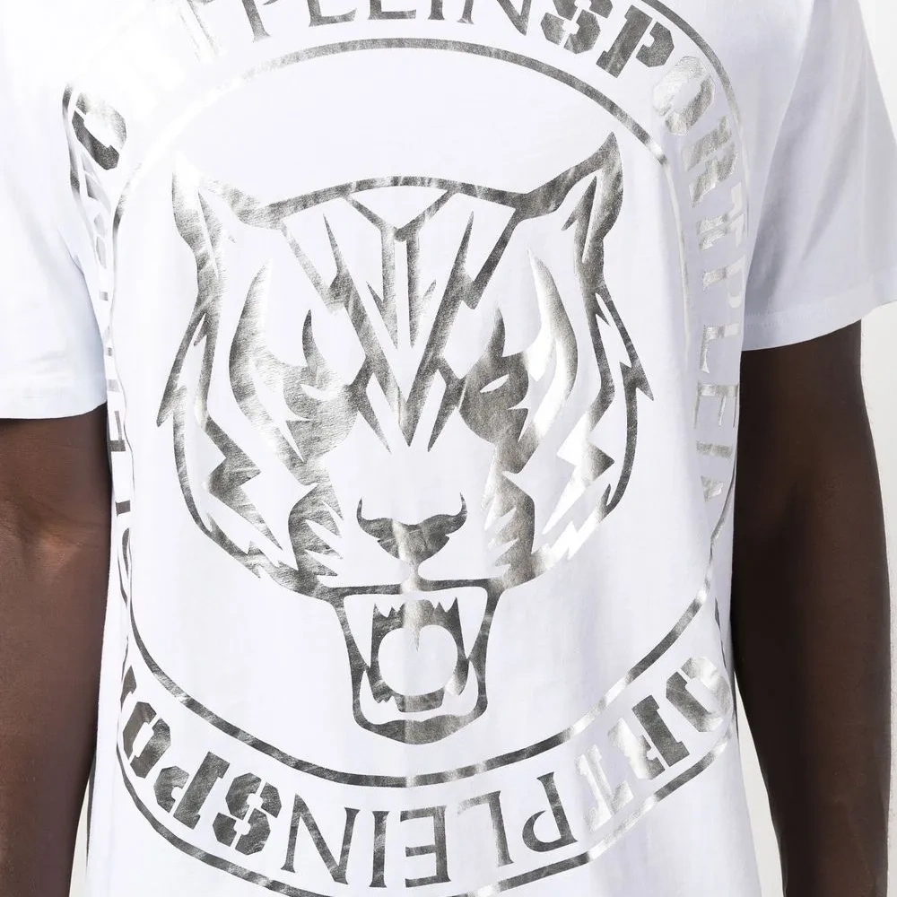 Расцветка Cloud White, смесовый хлопок, декор Tiger Head, круглый вырез, короткие рукава и прямой подол.
