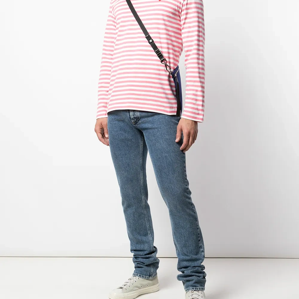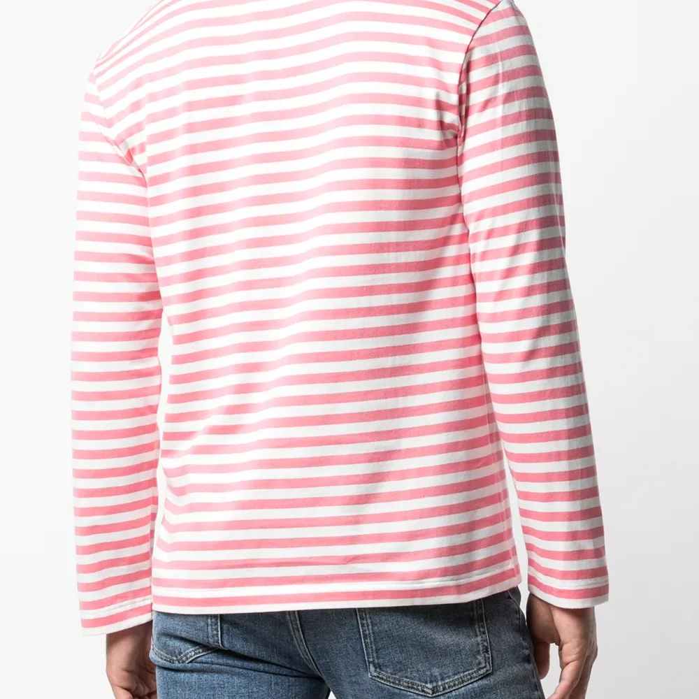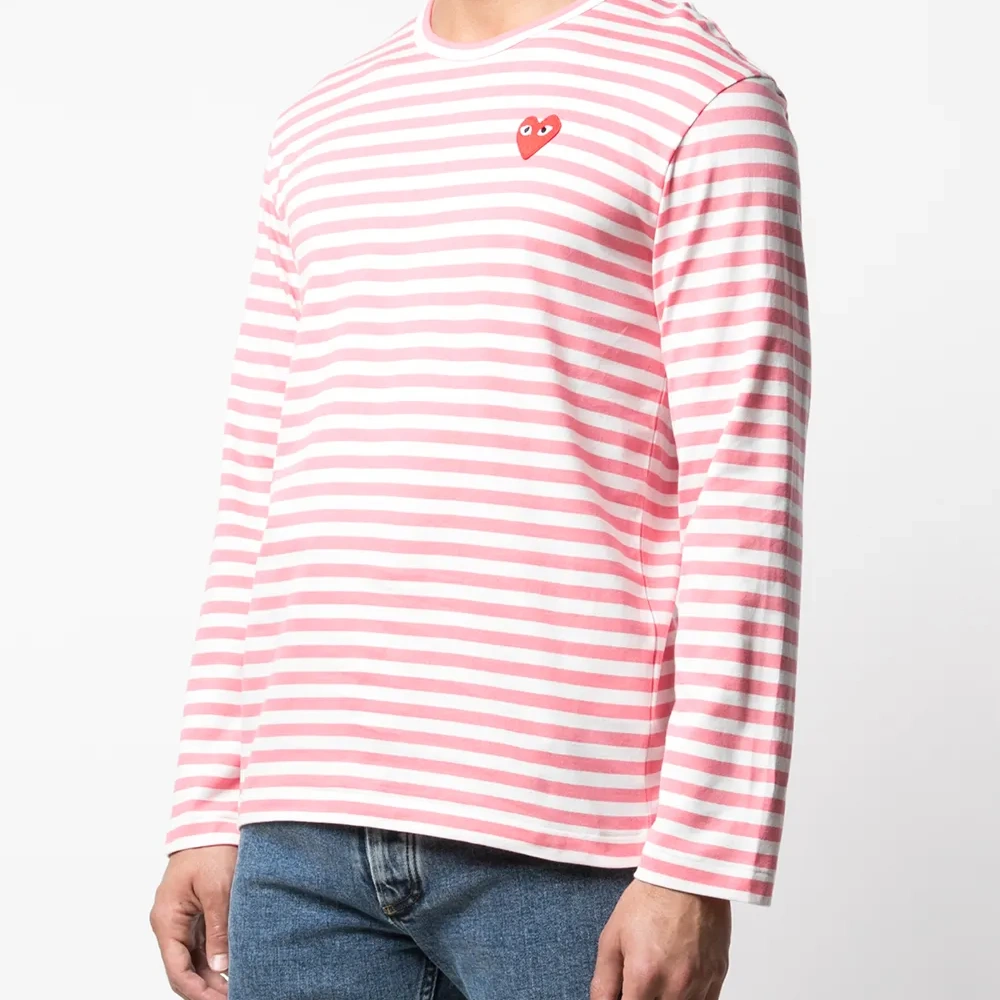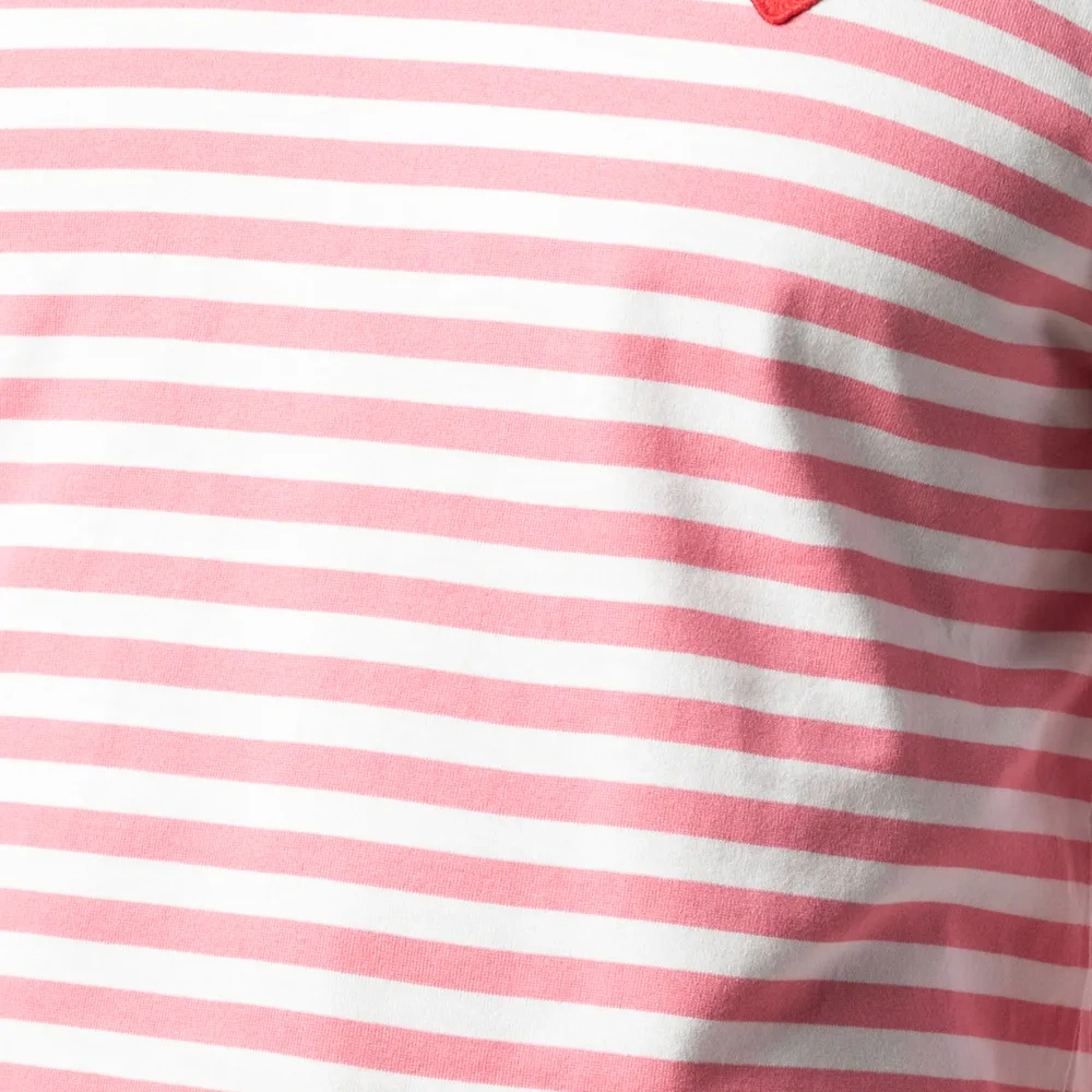 Полосатая футболка с логотипом от Comme des Garçons Play. Горизонтальные полоски, круглый вырез, заплатка с логотипом спереди, длинные рукава и прямой подол. Цвет: розовый.