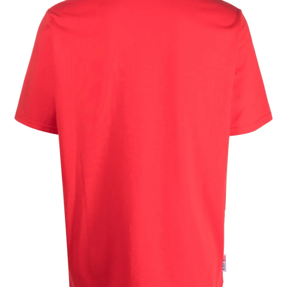 Красный, хлопок, принт с логотипом на груди, круглый вырез, короткие рукава и прямой подол.