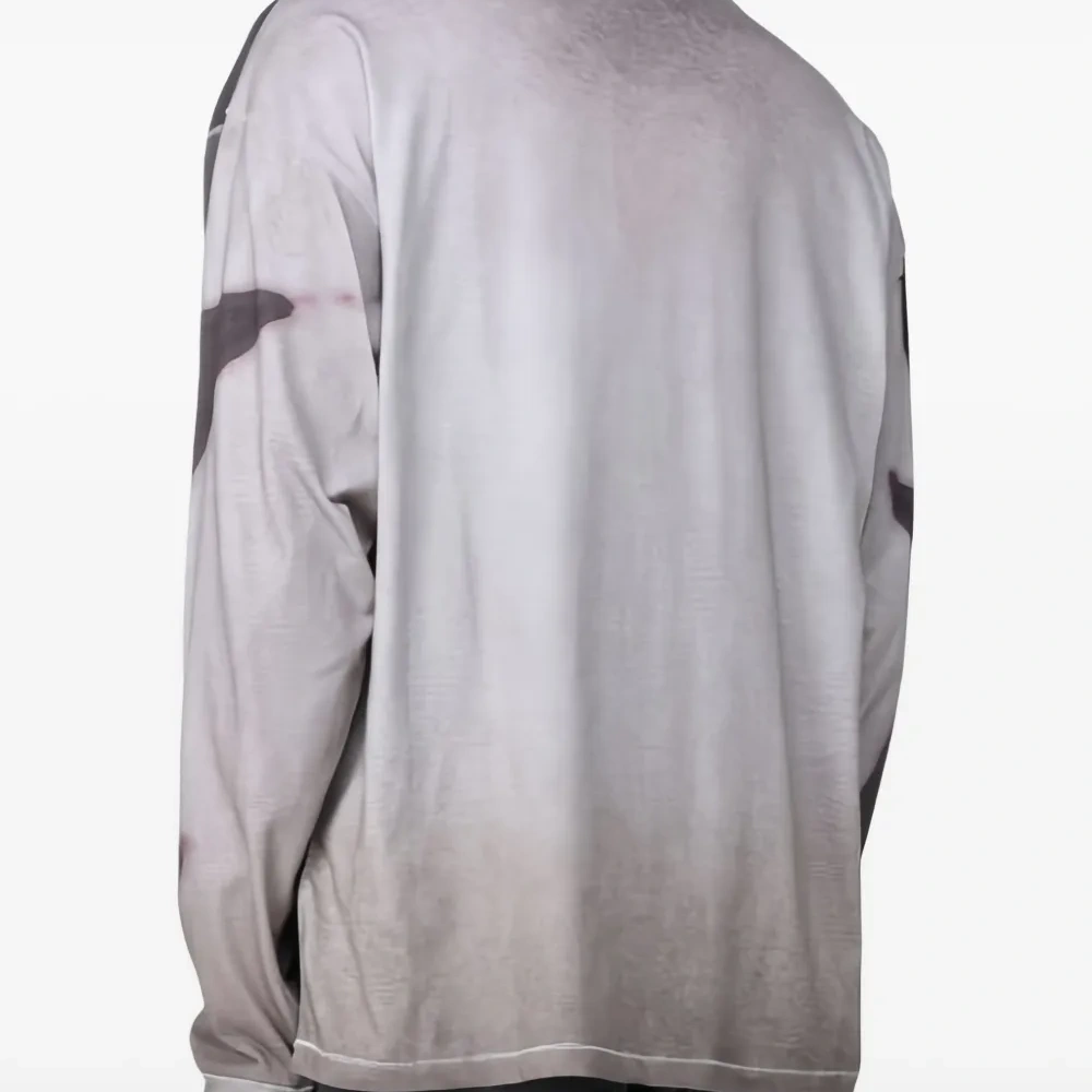 Серая футболка с длинными рукавами, круглым вырезом, тональной прострочкой и графичным принтом