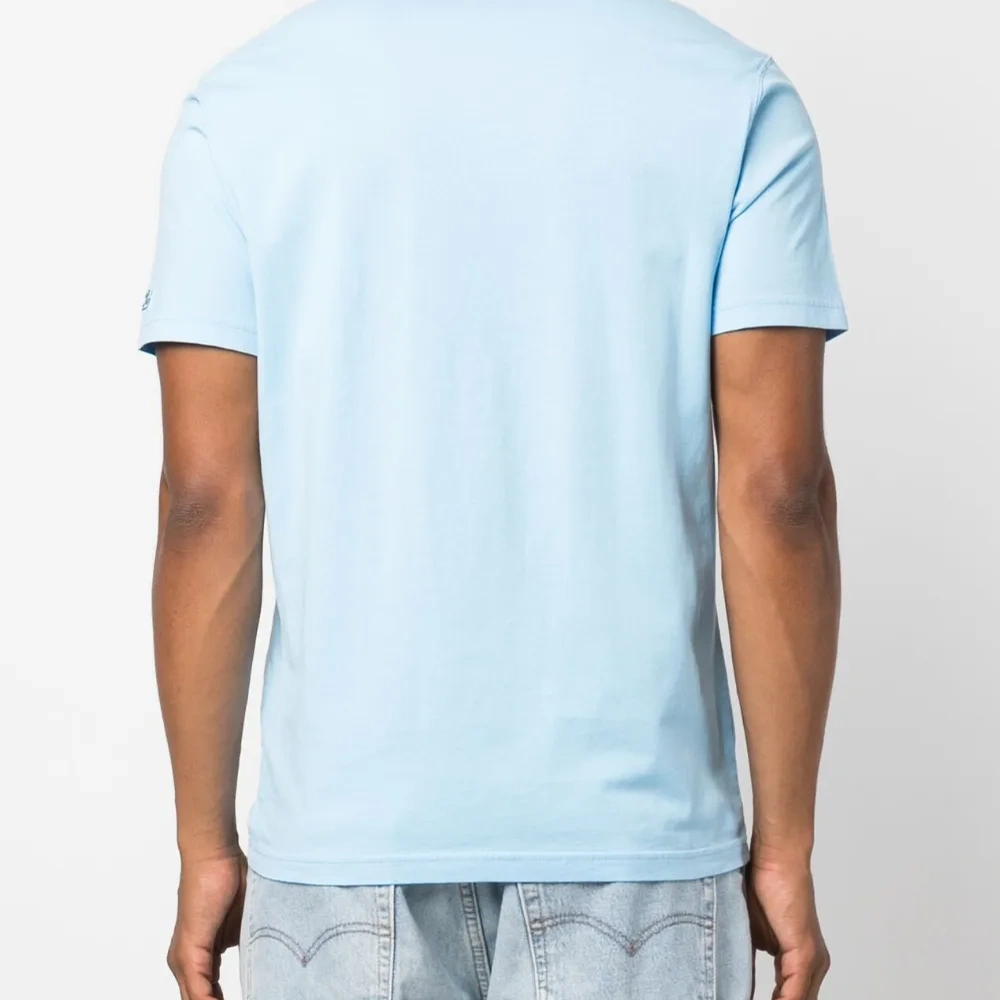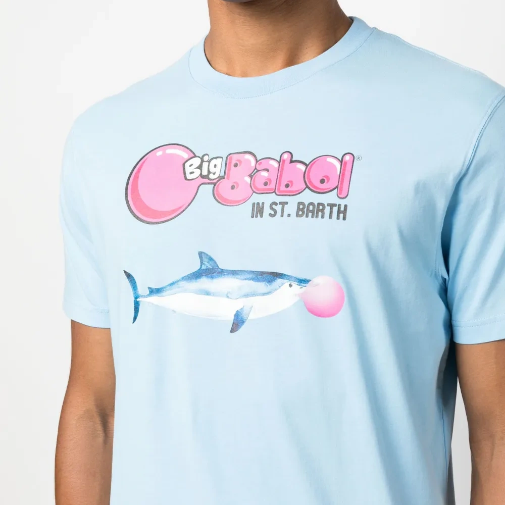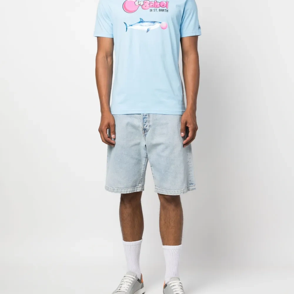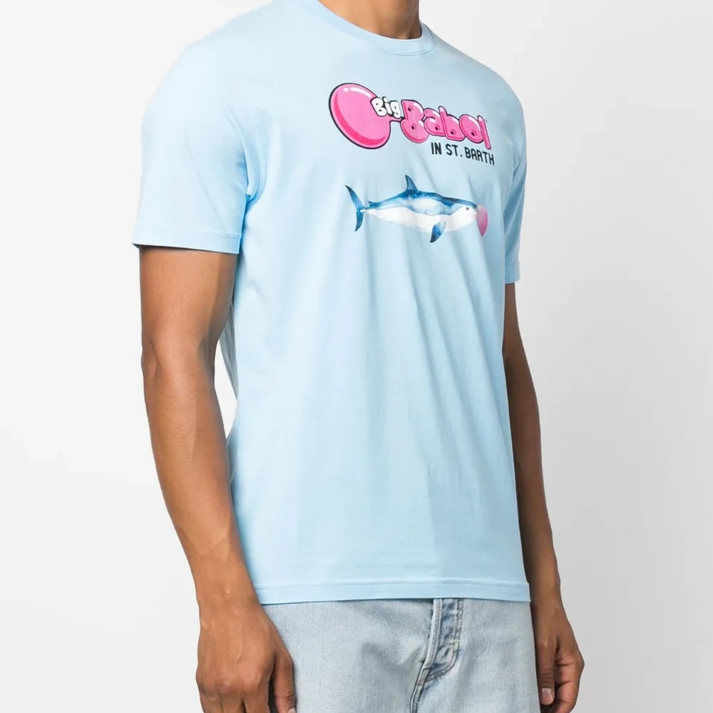 Голубой, разноцветный, хлопок, ткань джерси, принт с изображением акулы, графичный принт спереди, вышитый логотип на рукаве, круглый вырез, короткие рукава и прямой подол.