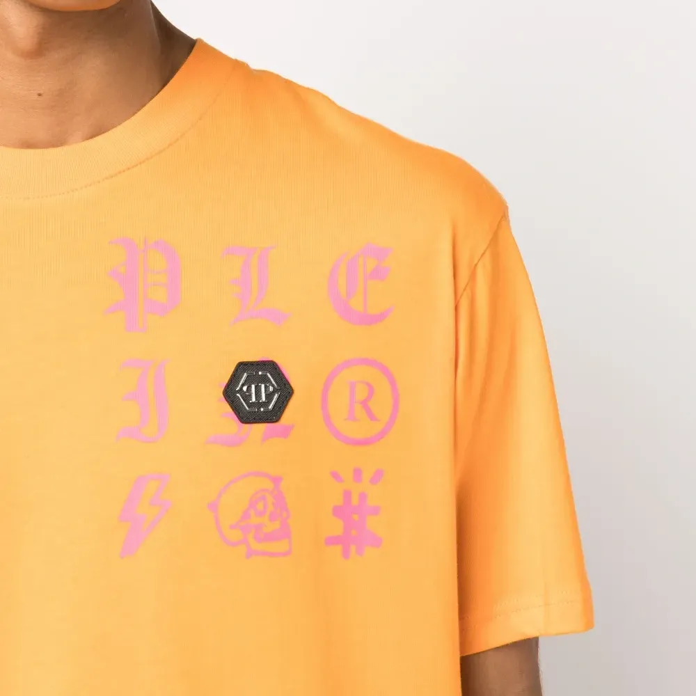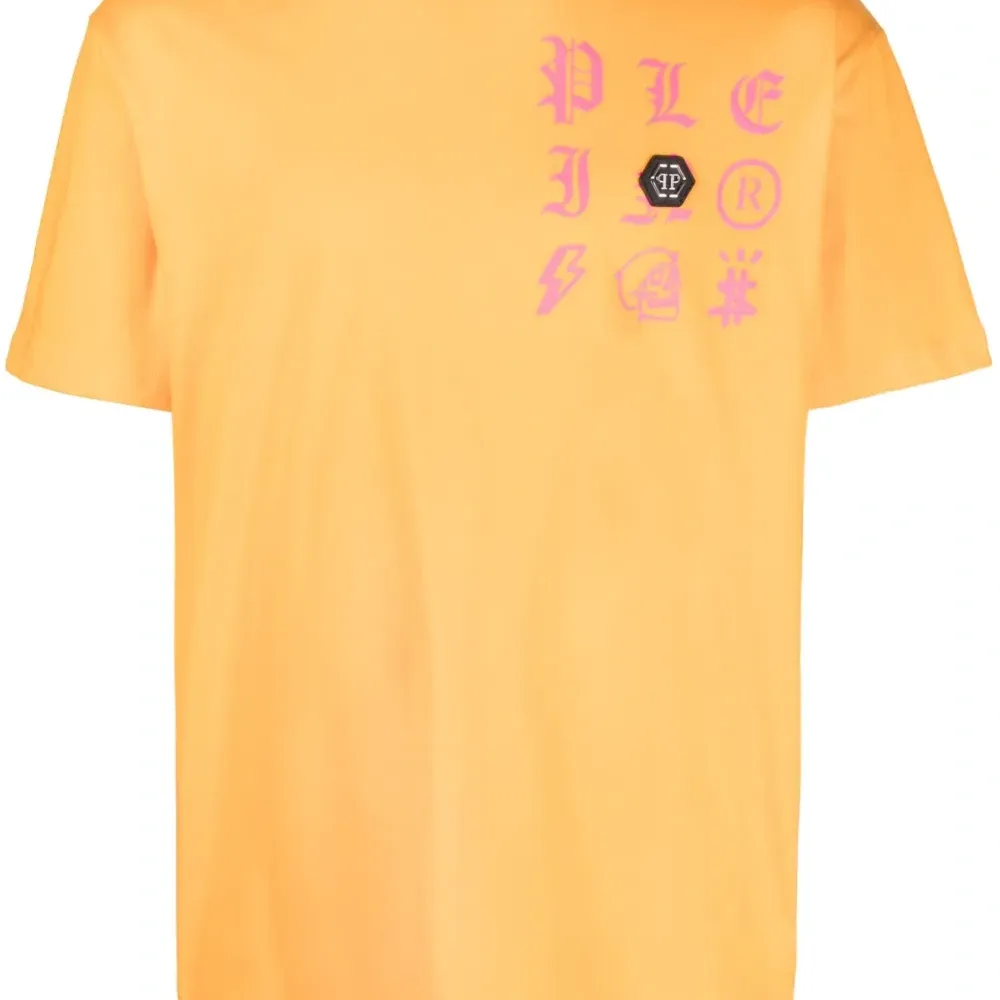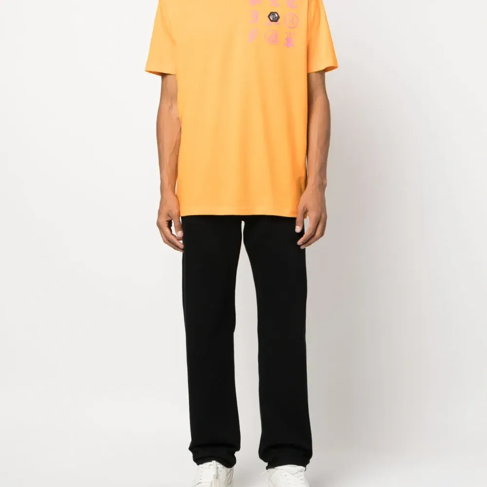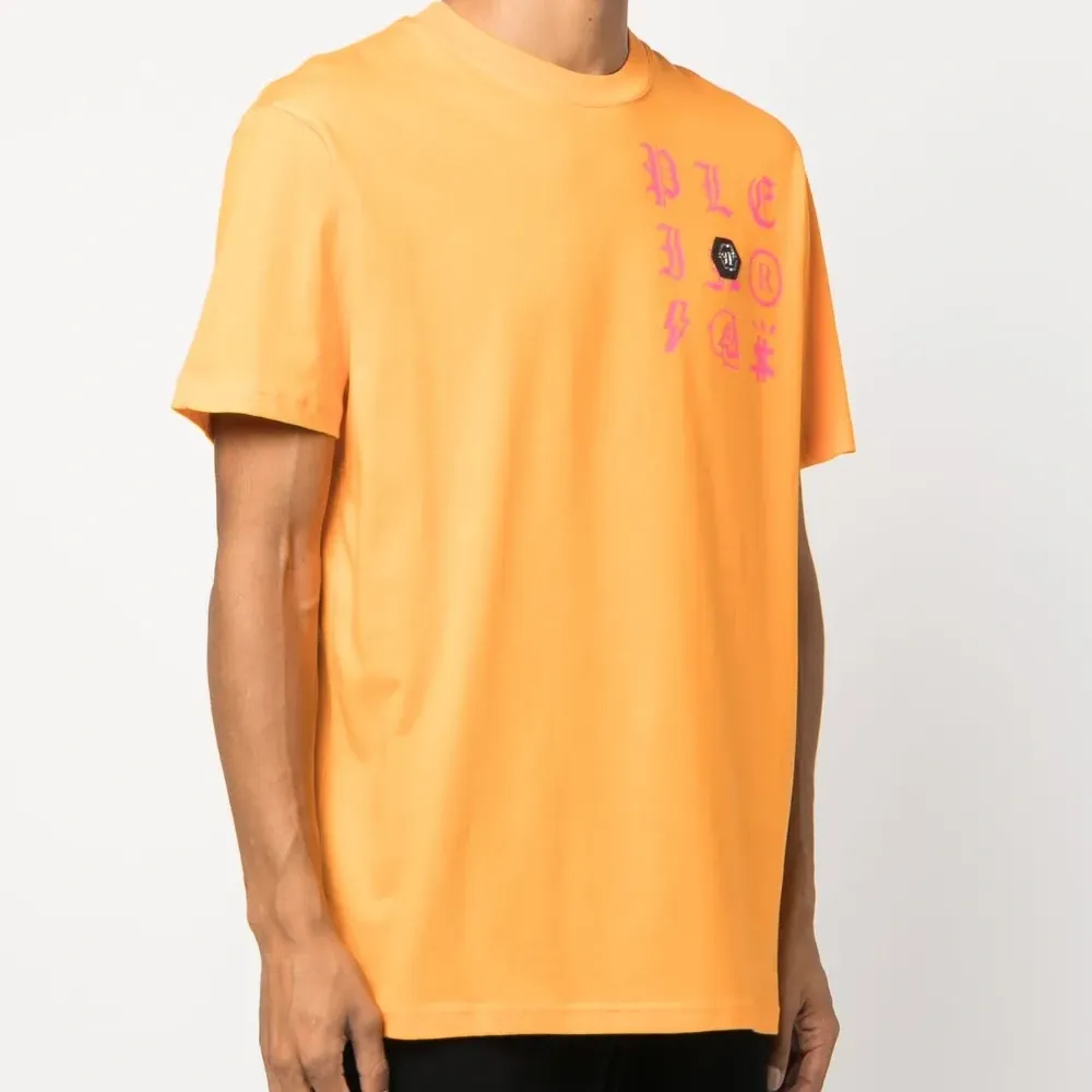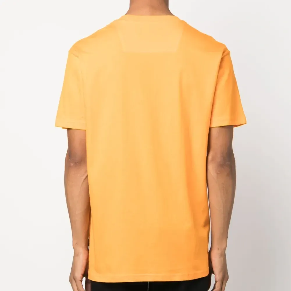 Янтарно-оранжевый, хлопок, принт с логотипом на груди, нашивка с логотипом на груди, круглый вырез, короткие рукава и прямой подол.