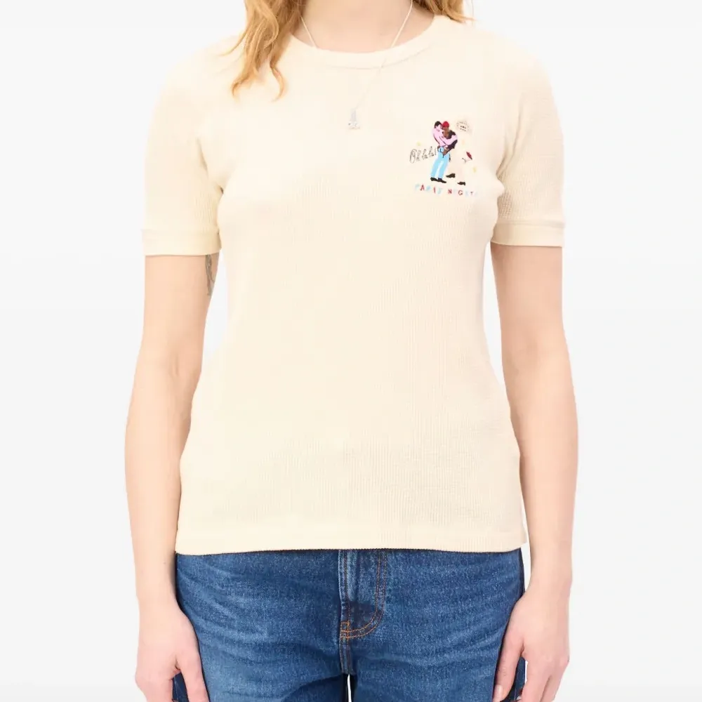кремовый цвет, вышитый дизайн, круглый вырез, короткие рукава, ребристая текстура