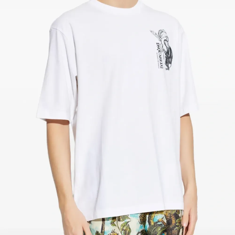 белая хлопковая футболка с графическим принтом, круглым вырезом и короткими рукавами