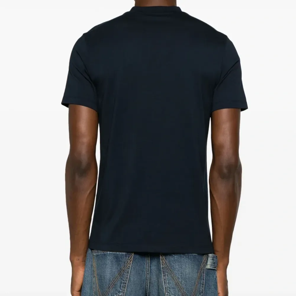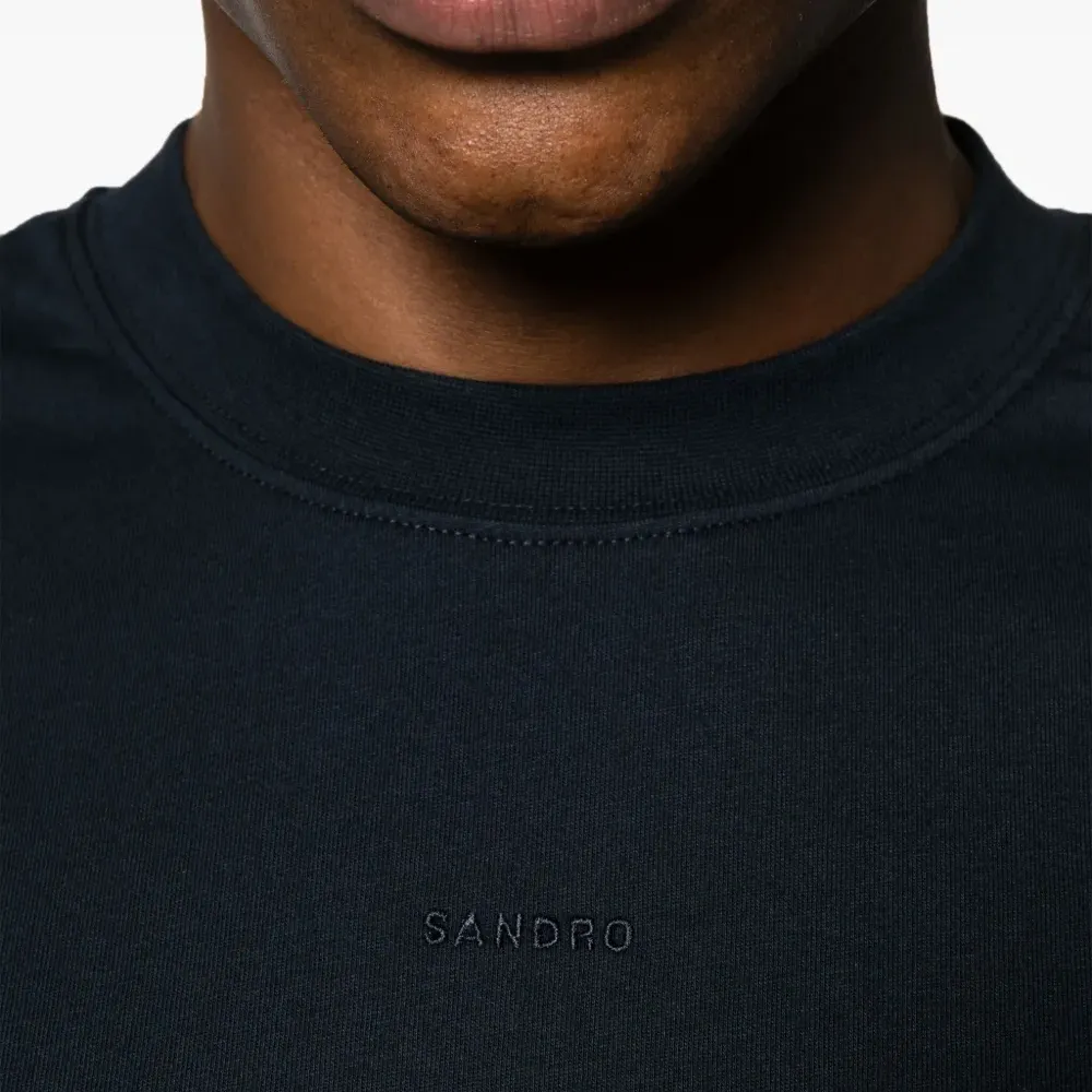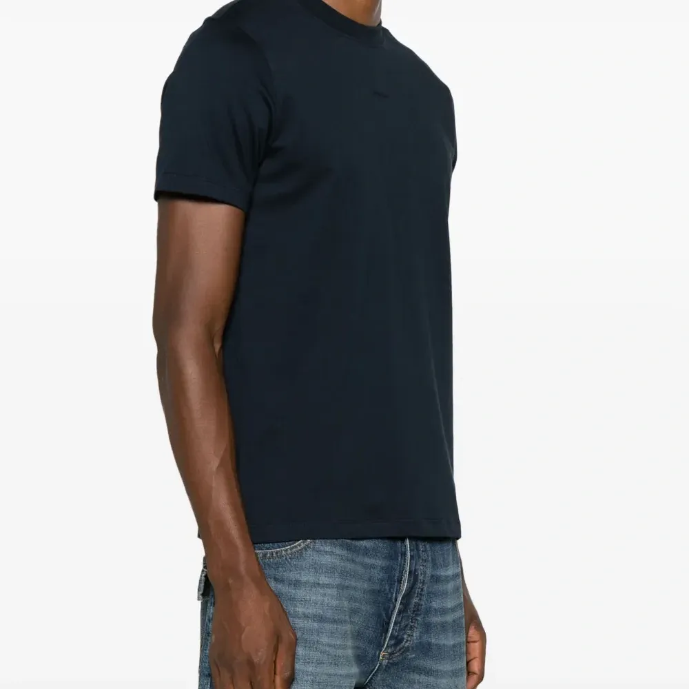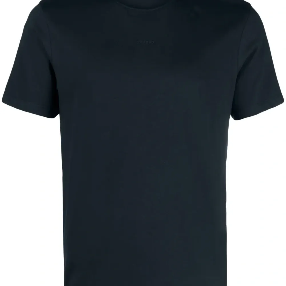 Темно-синий, хлопок, вышитый логотип спереди, круглый вырез, короткие рукава и прямой подол.