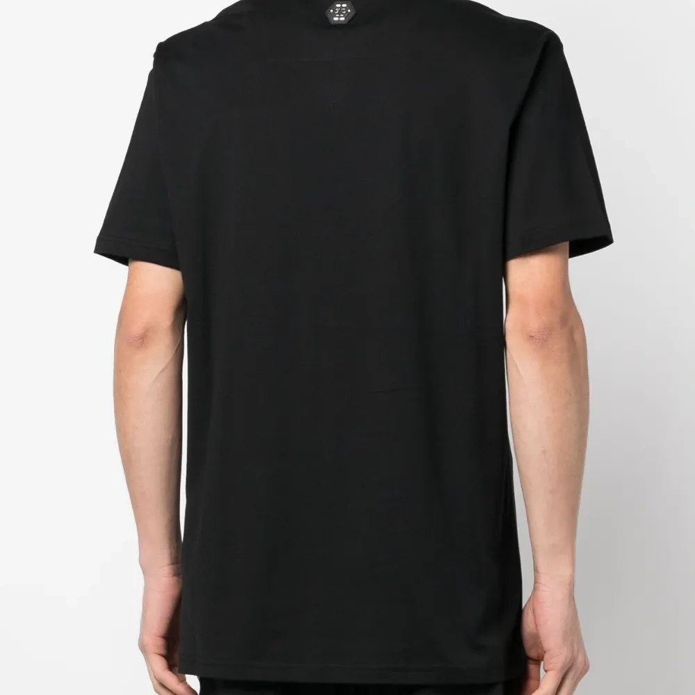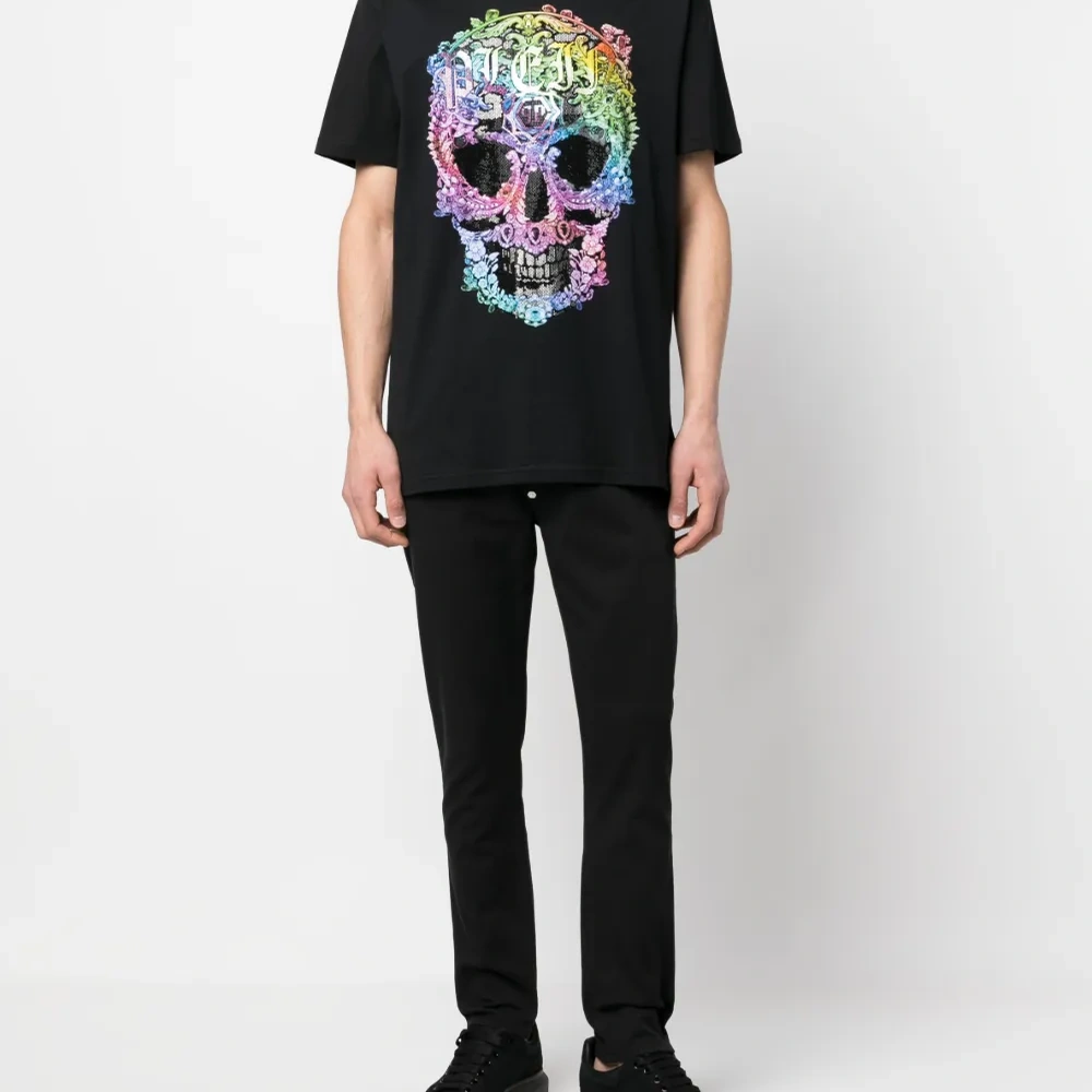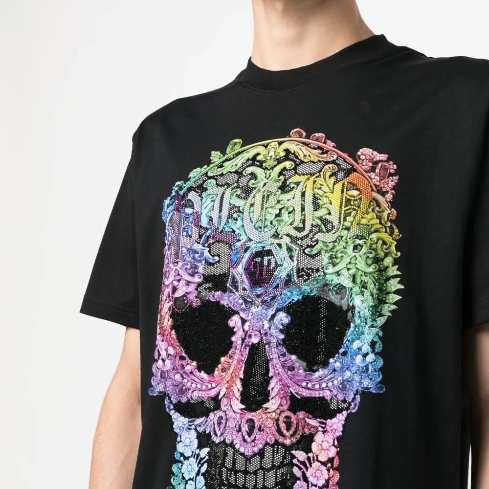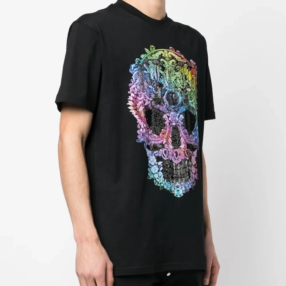 Черный/разноцветный, принт с изображением черепа спереди, логотип спереди, украшения из горного хрусталя, градиентный эффект, нашивка с логотипом сзади, круглый вырез, короткие рукава и прямой подол.