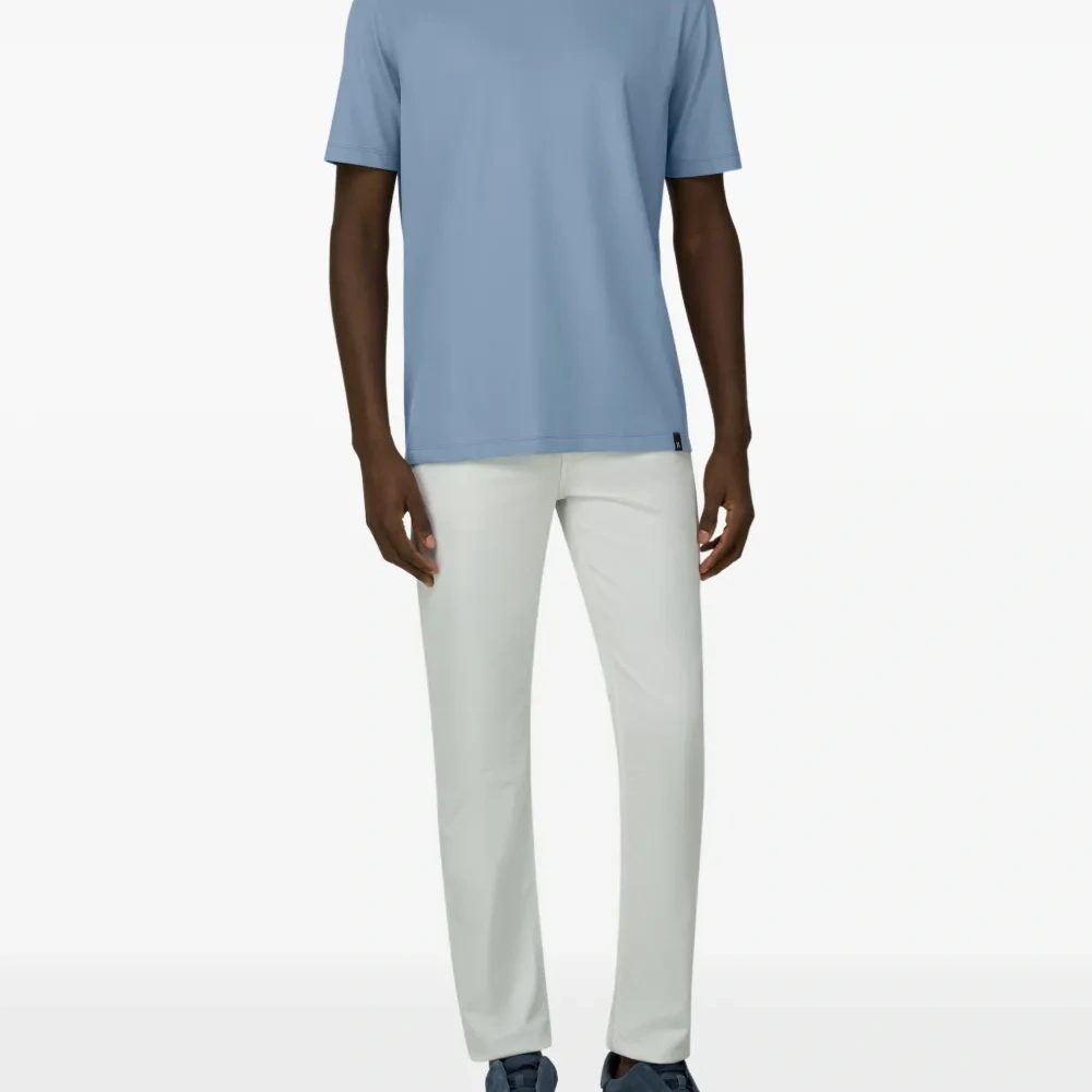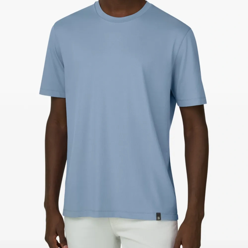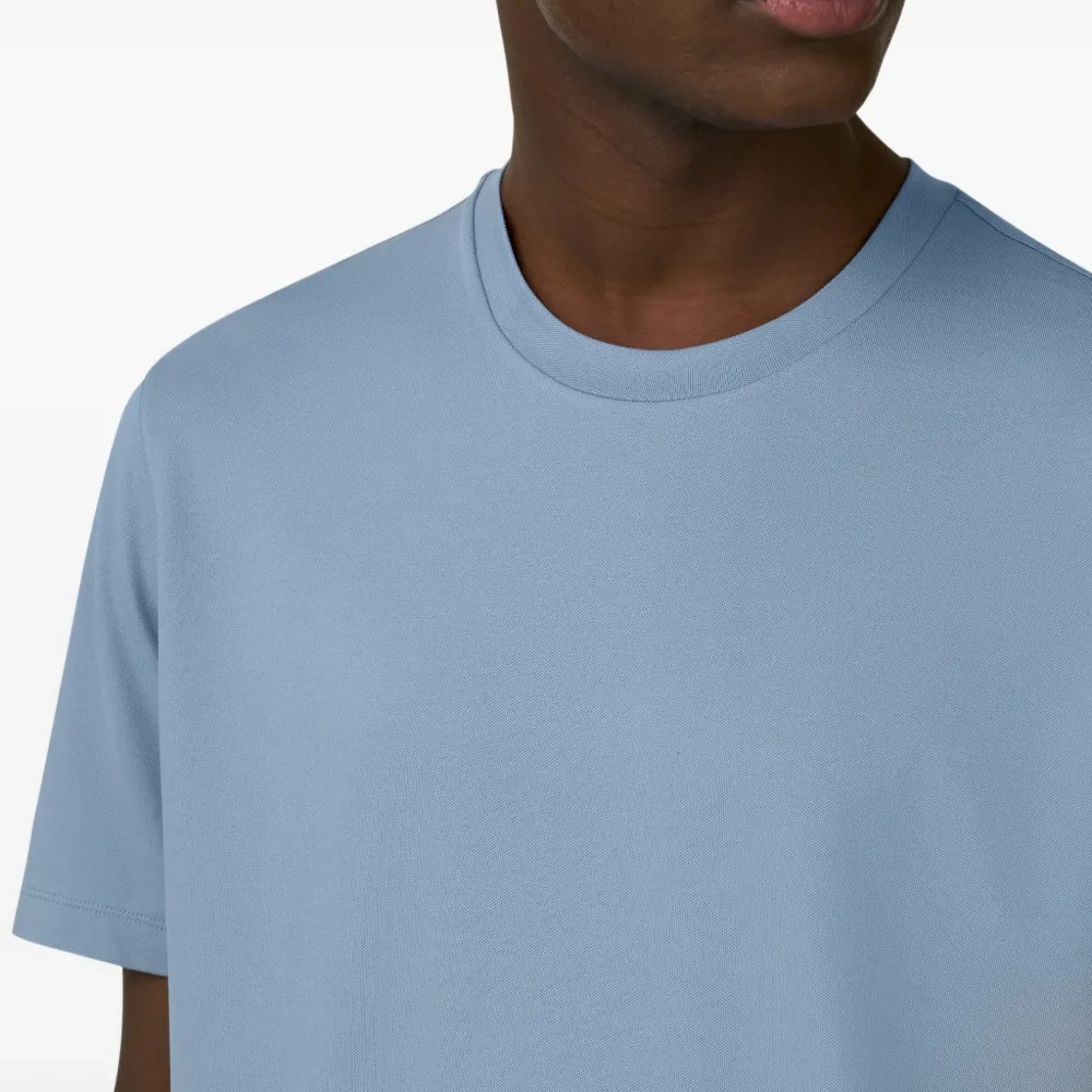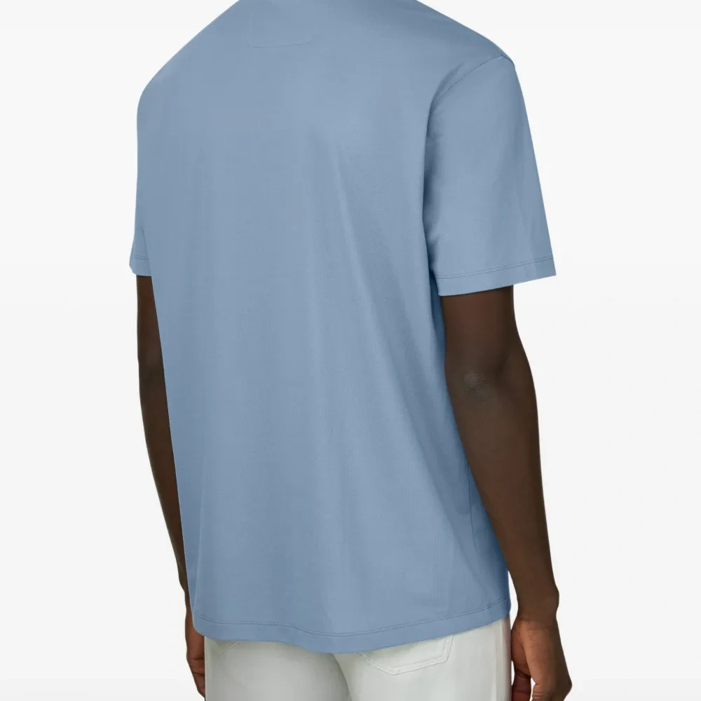 светло-голубой, текстура пике, аппликация по подолу, короткие рукава, круглый вырез