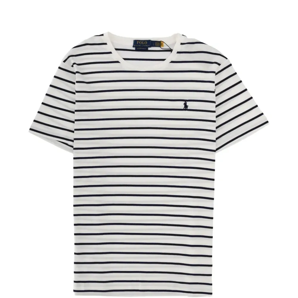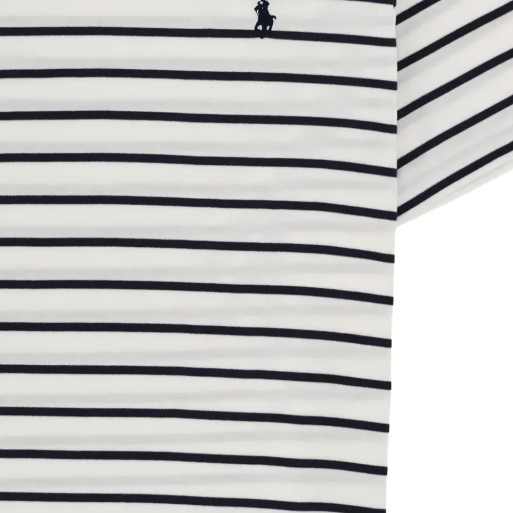 белый с полосатым дизайном, с логотипом, круглый вырез, короткие рукава