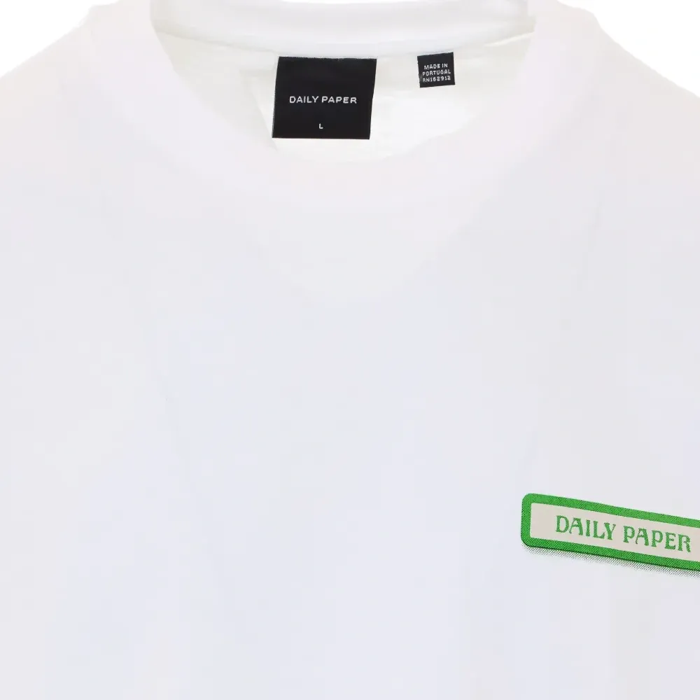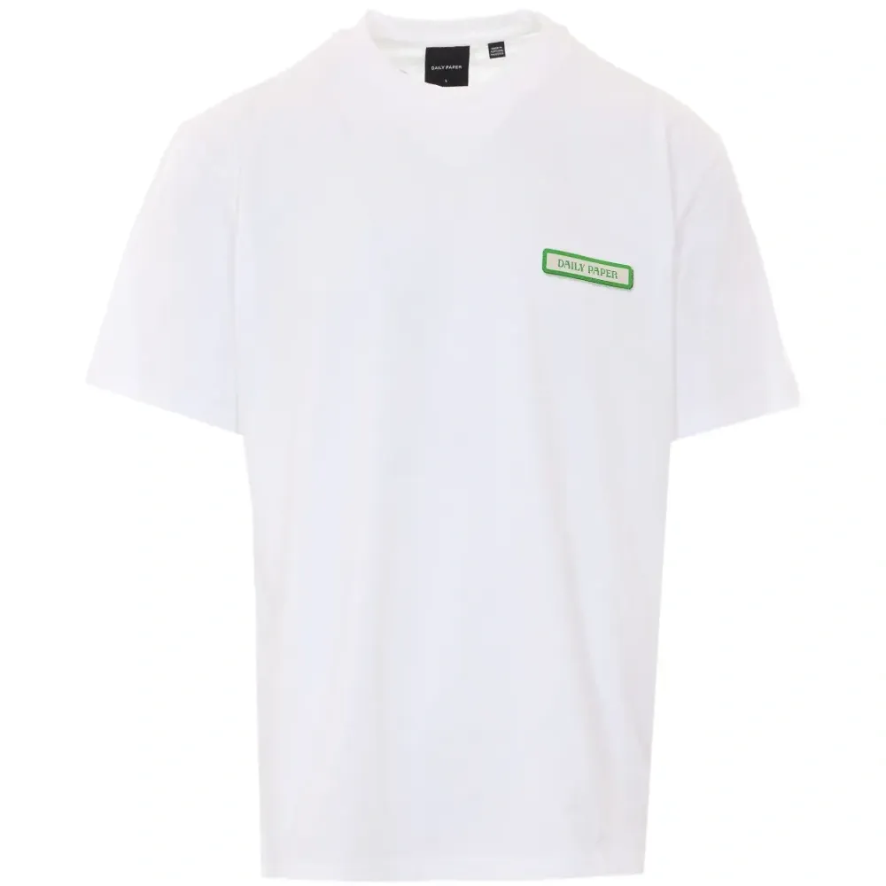белая футболка с круглым вырезом, принтом логотипа на спине, графическим принтом, свободным кроем и короткими рукавами