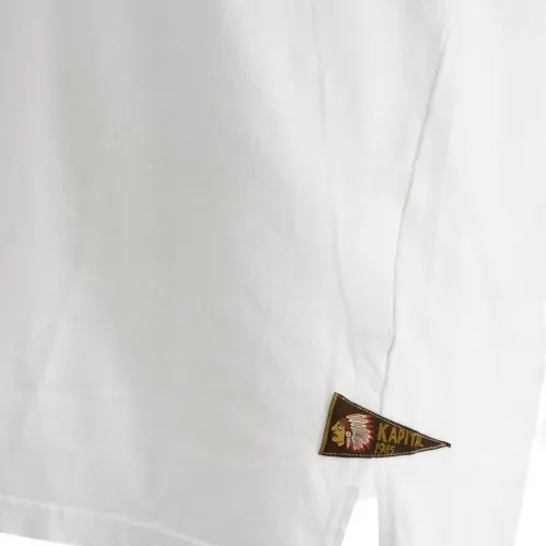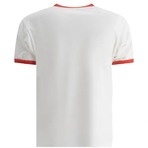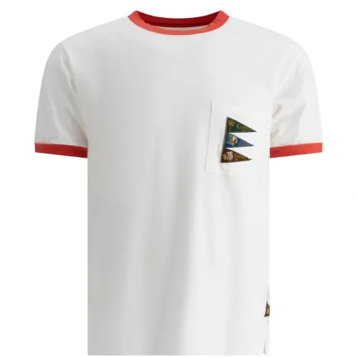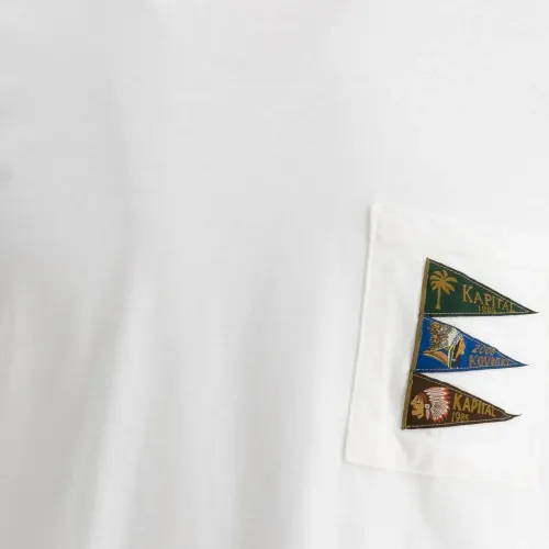 белая футболка с контрастной отделкой на воротнике и рукавах, нагрудным карманом с флажком, короткими рукавами и прямым подолом