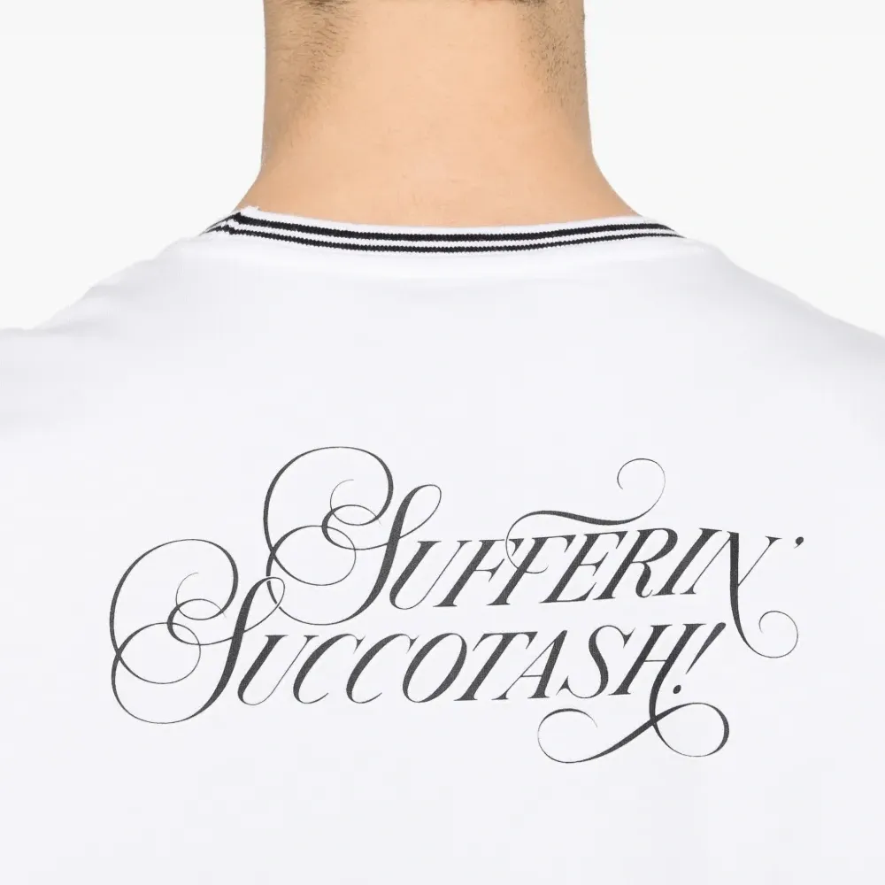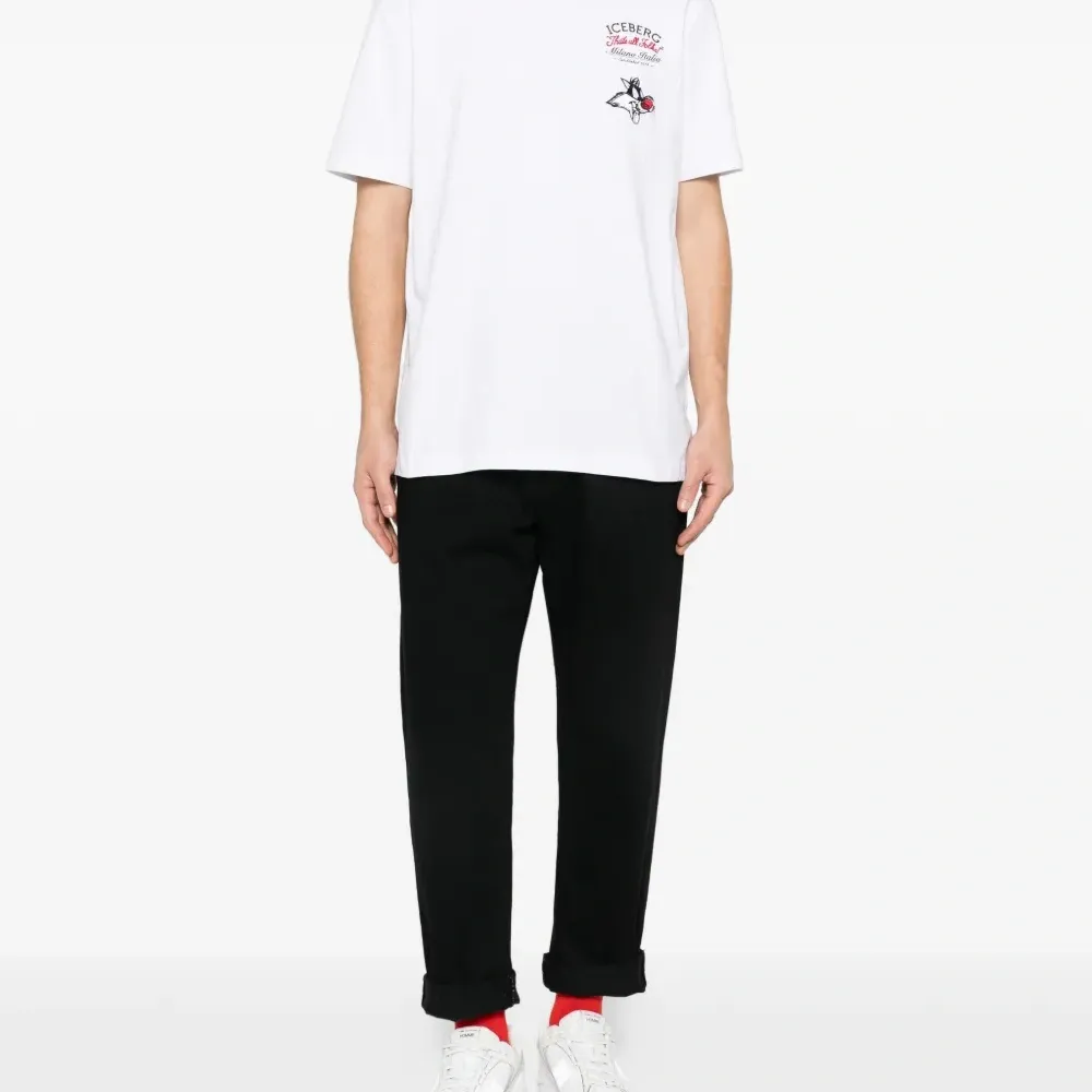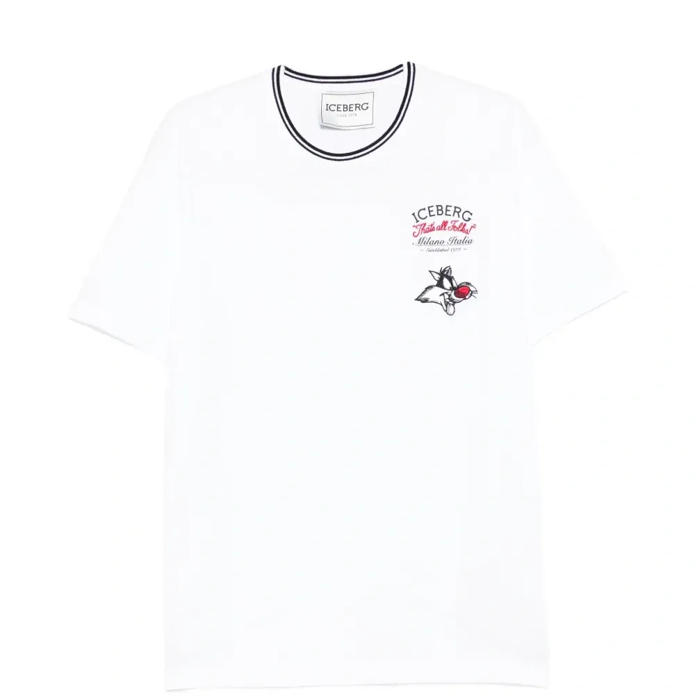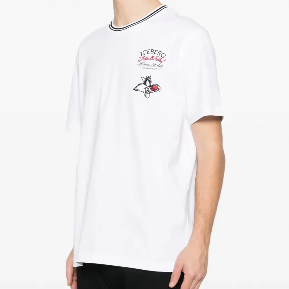 белая футболка с графическим принтом, круглым вырезом, полосатой отделкой и короткими рукавами