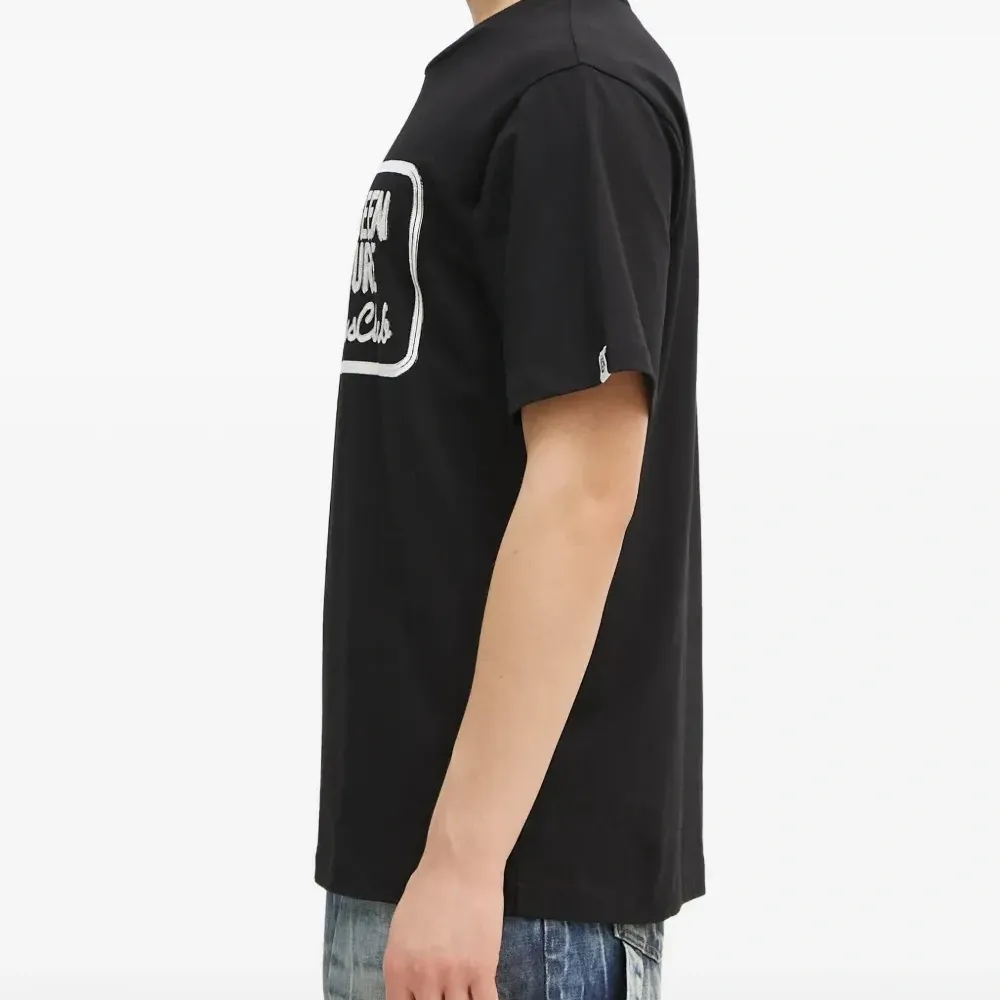 чёрная футболка с круглым вырезом, принтом-слоганом, короткими рукавами и логотипом