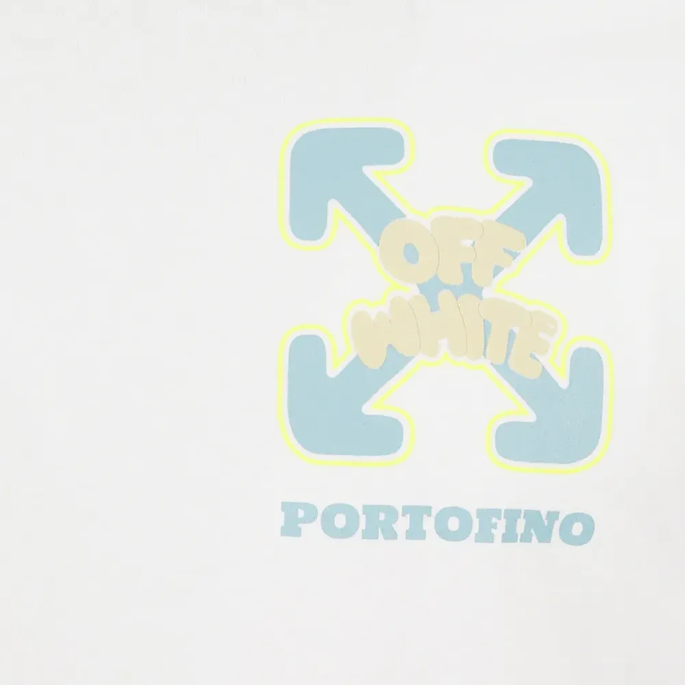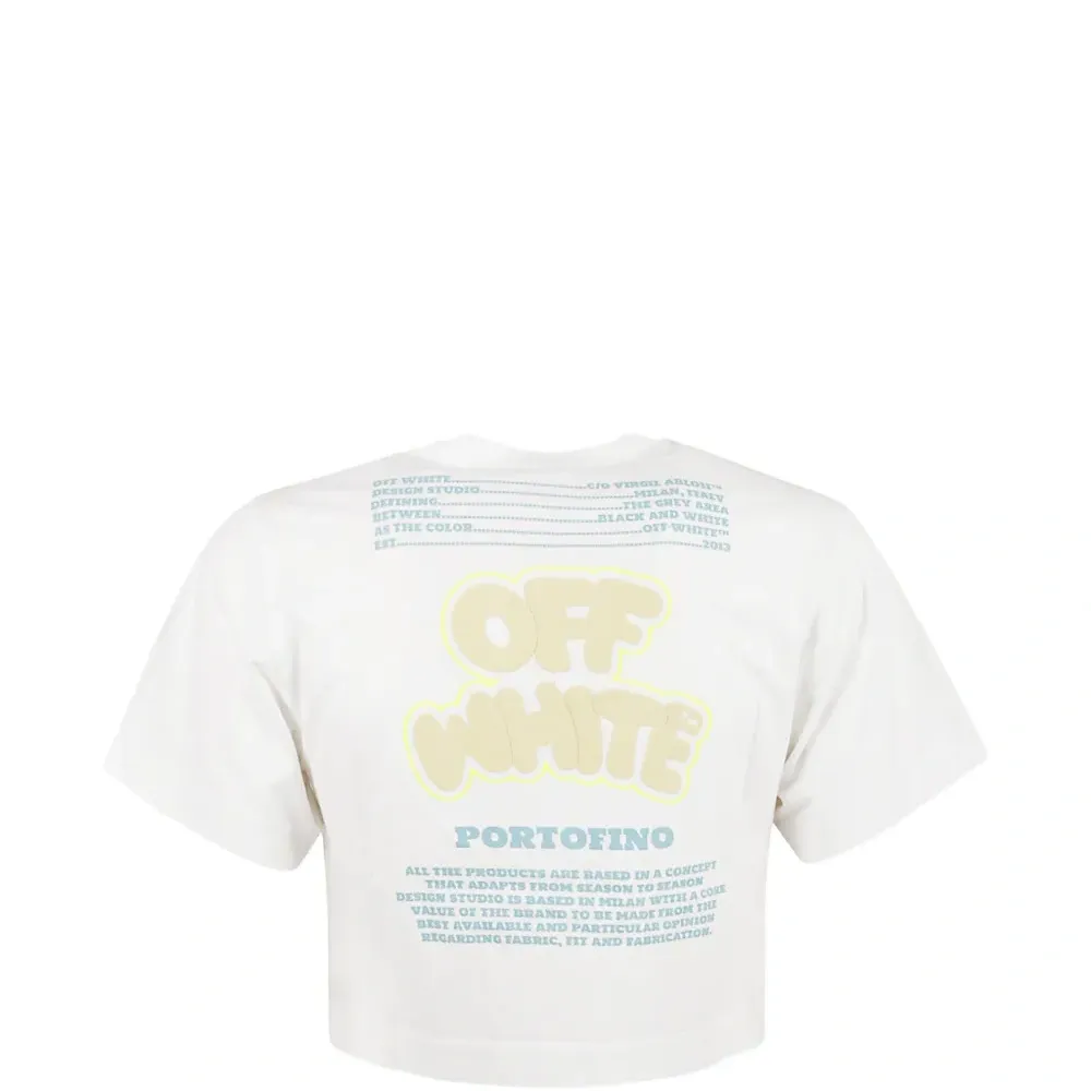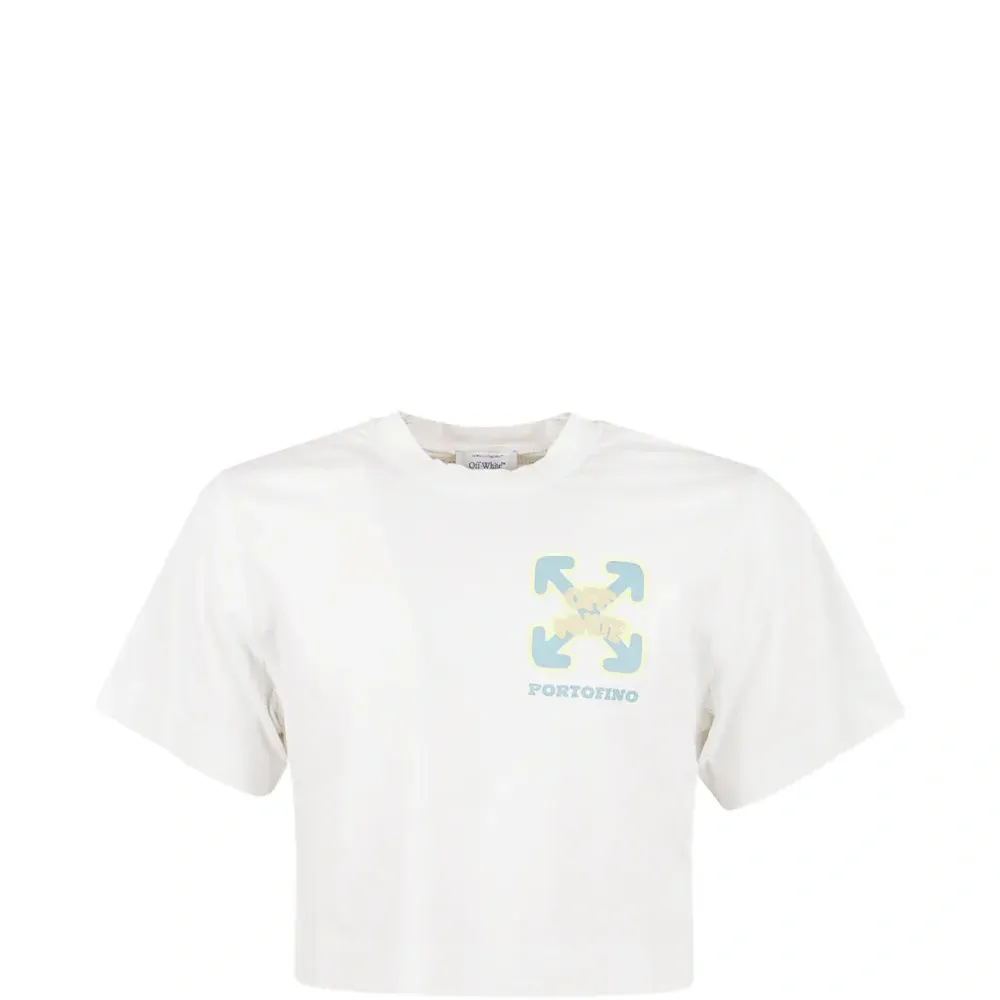 белая укороченная футболка с круглым вырезом, короткими рукавами и графичным принтом