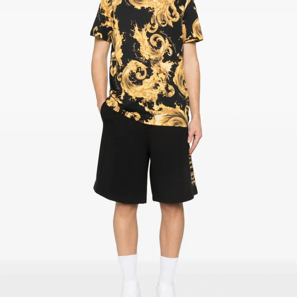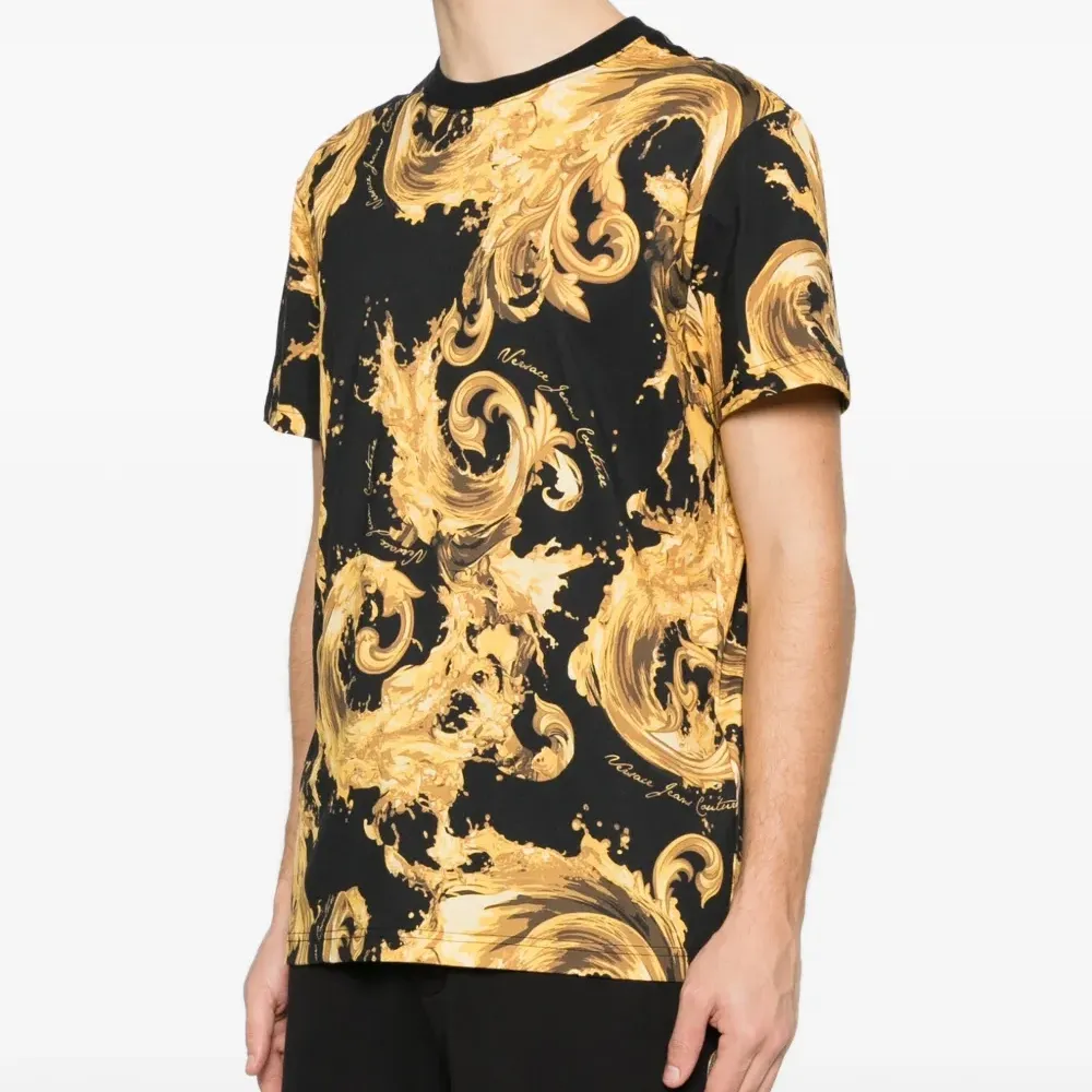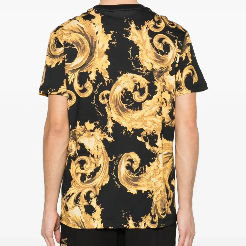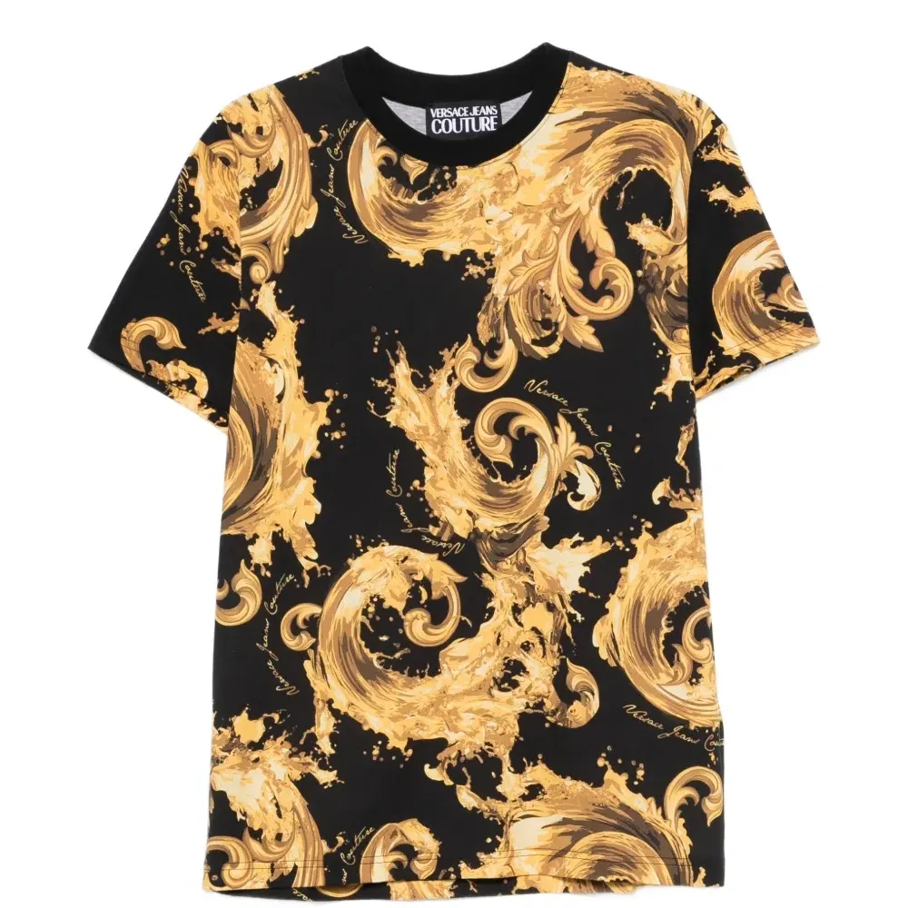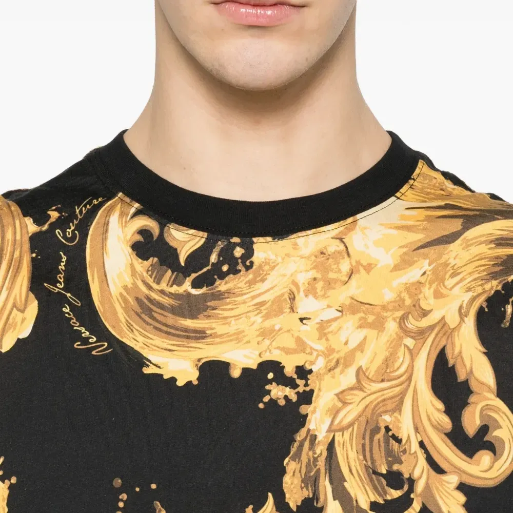 чёрная футболка с барочным принтом золотистого цвета, круглым вырезом и короткими рукавами