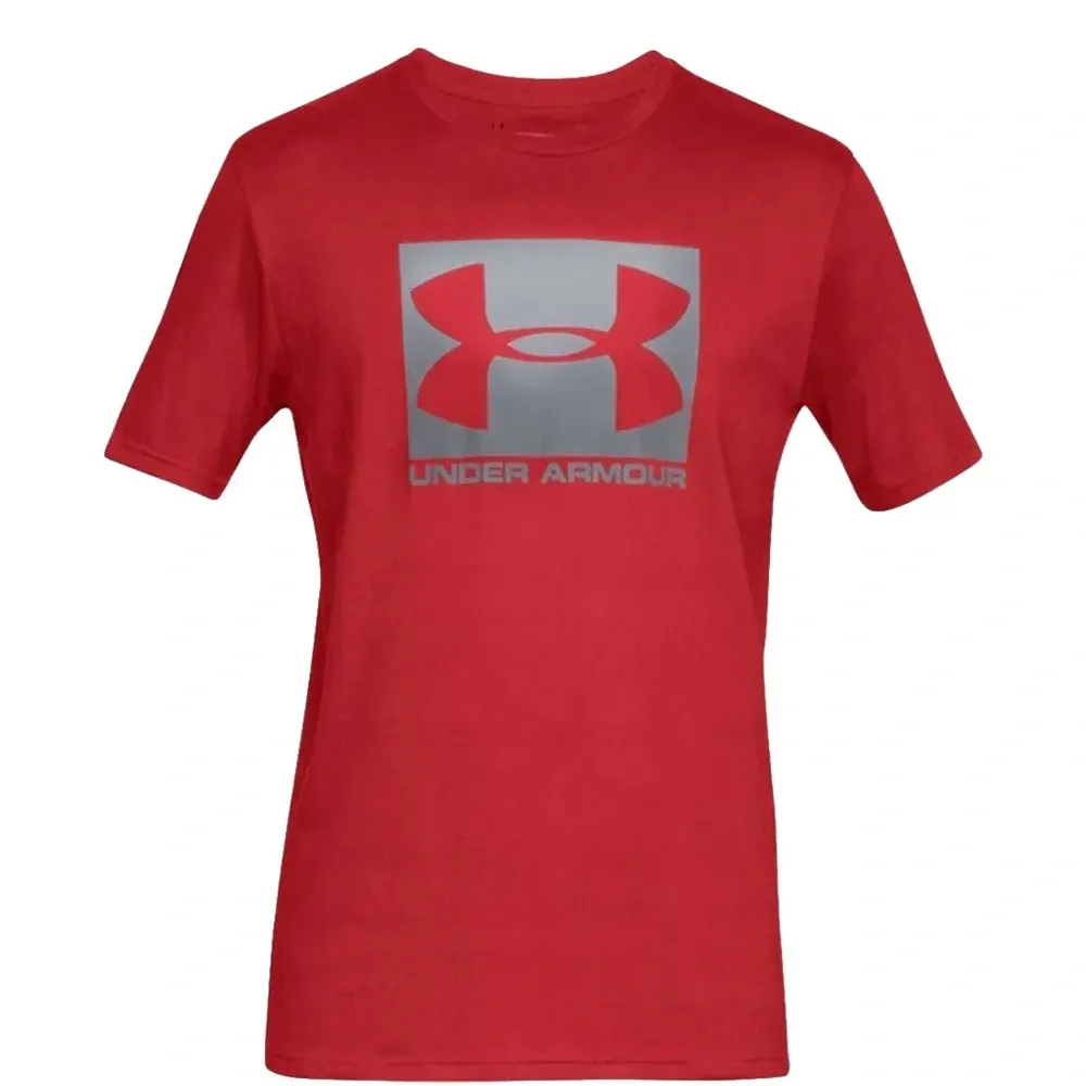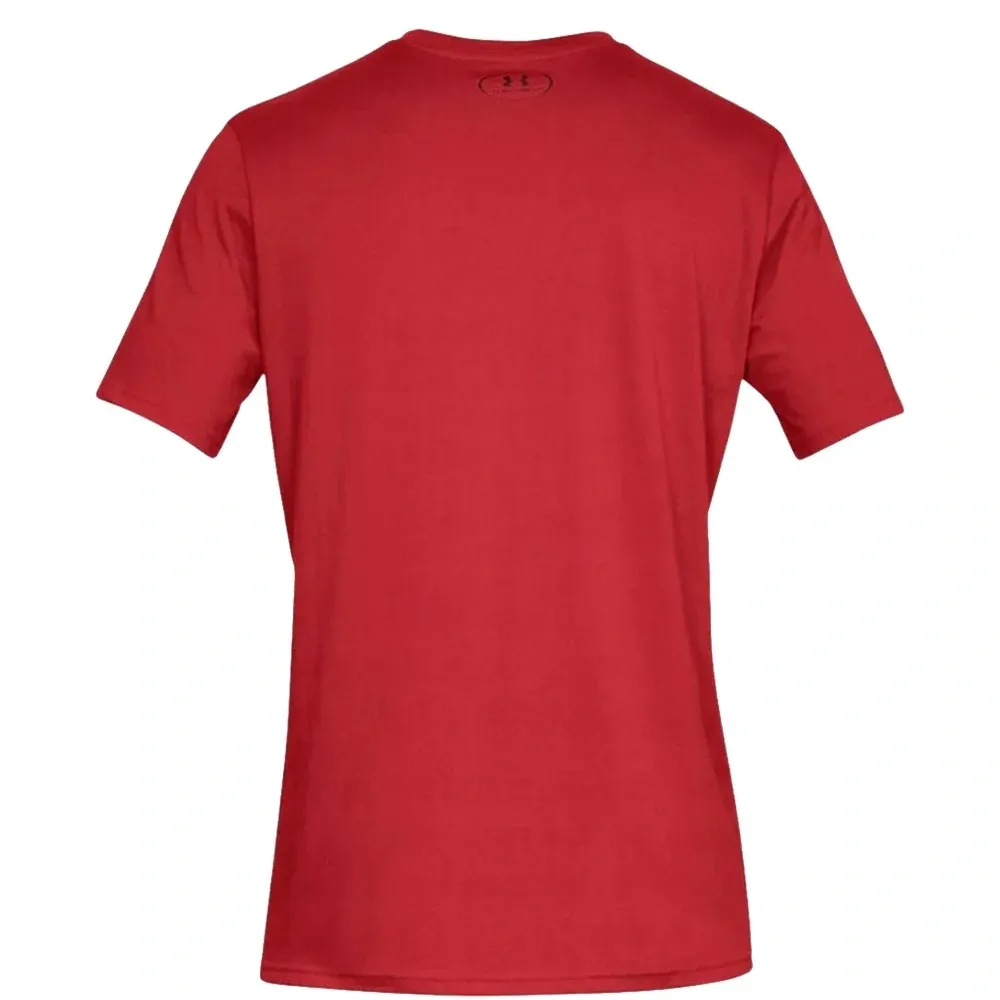 красная футболка с логотипом, короткими рукавами и круглым вырезом