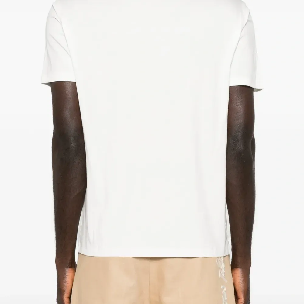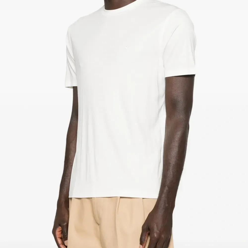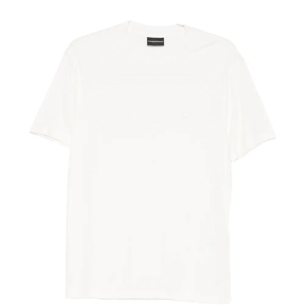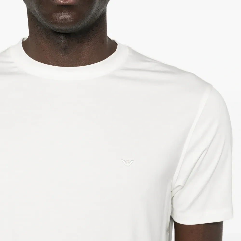 белая футболка с круглым вырезом, короткими рукавами и логотипом