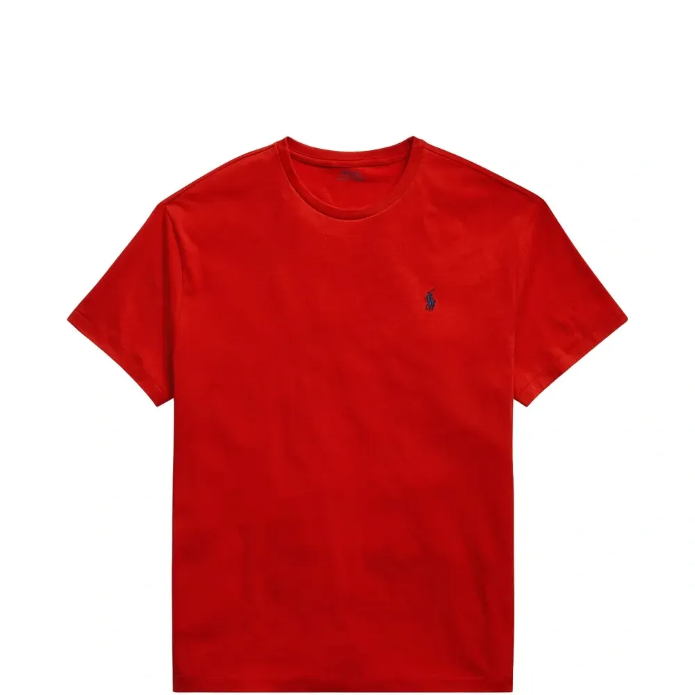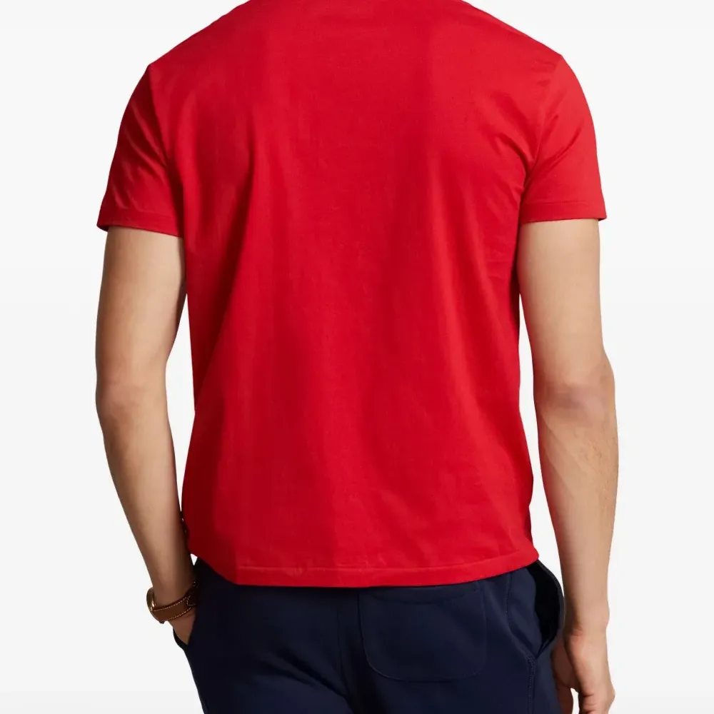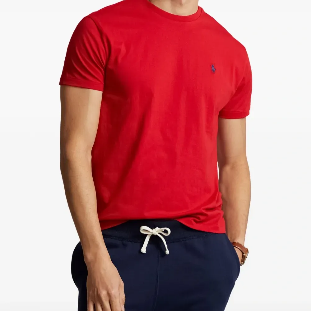 красная футболка с круглым вырезом, короткими рукавами и логотипом