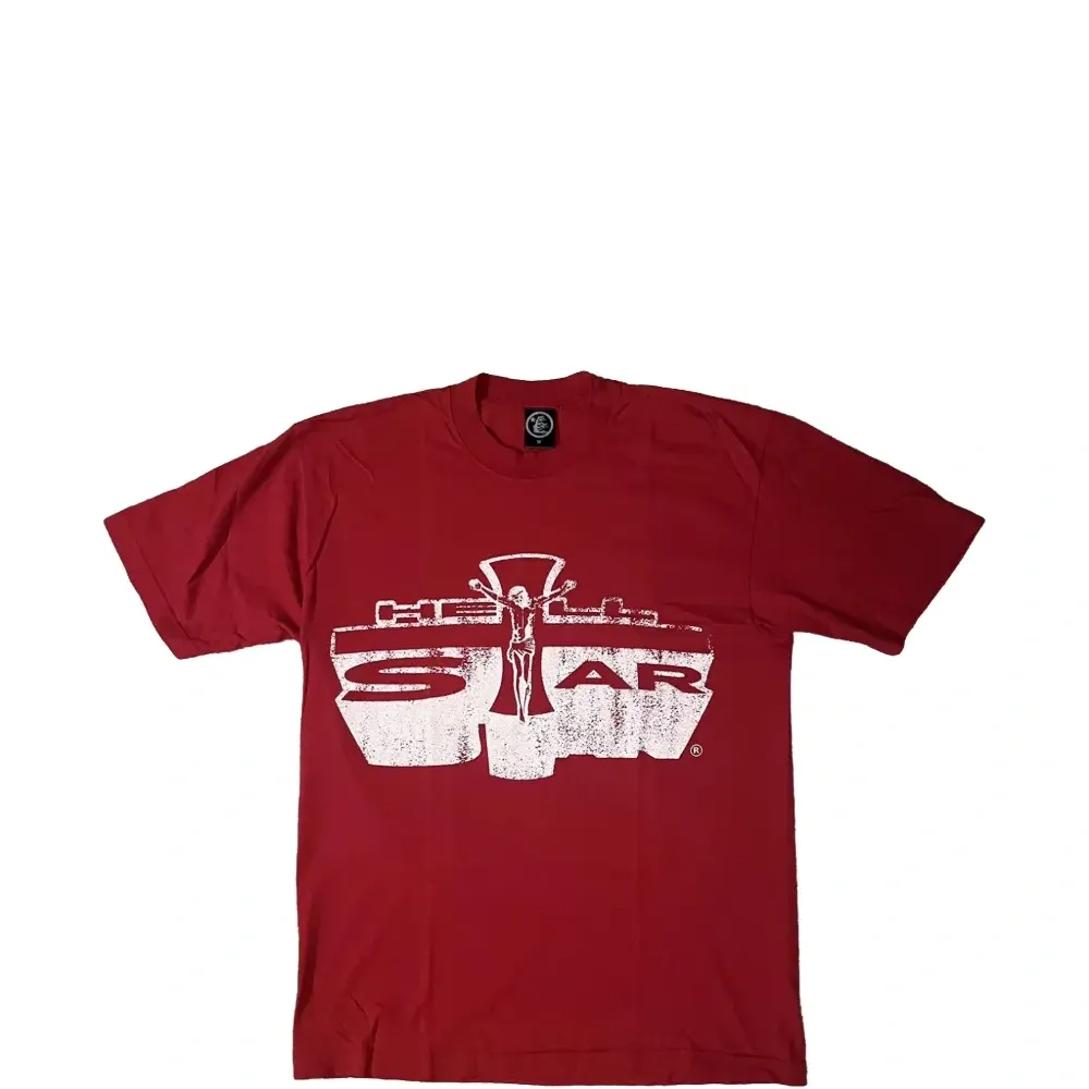 бордовая футболка с круглым вырезом, короткими рукавами и графическим принтом