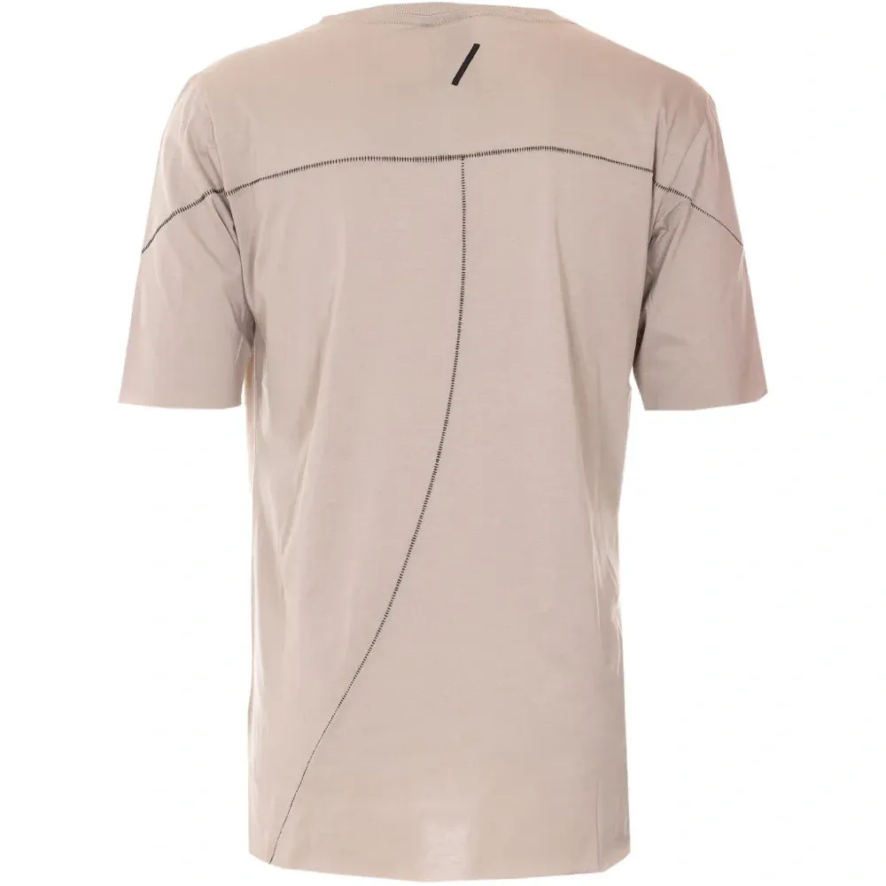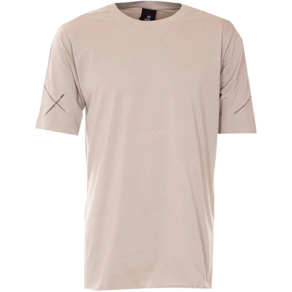 бежевый свитер свободного кроя с круглым вырезом, короткими рукавами и швами-декором