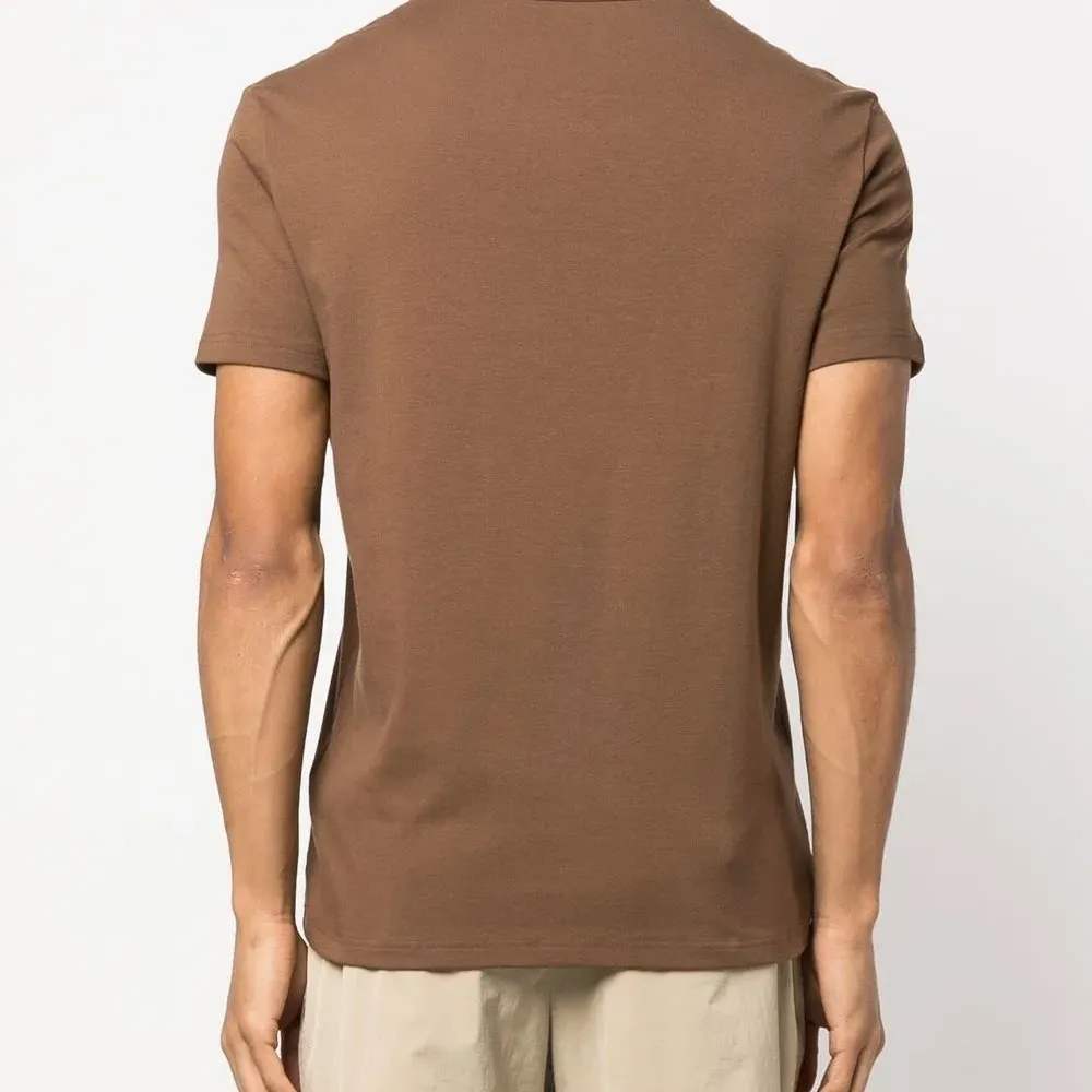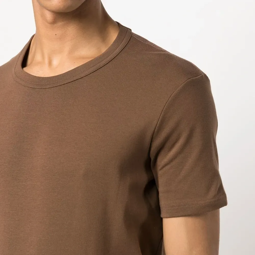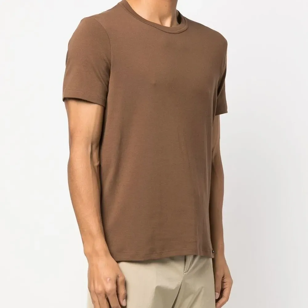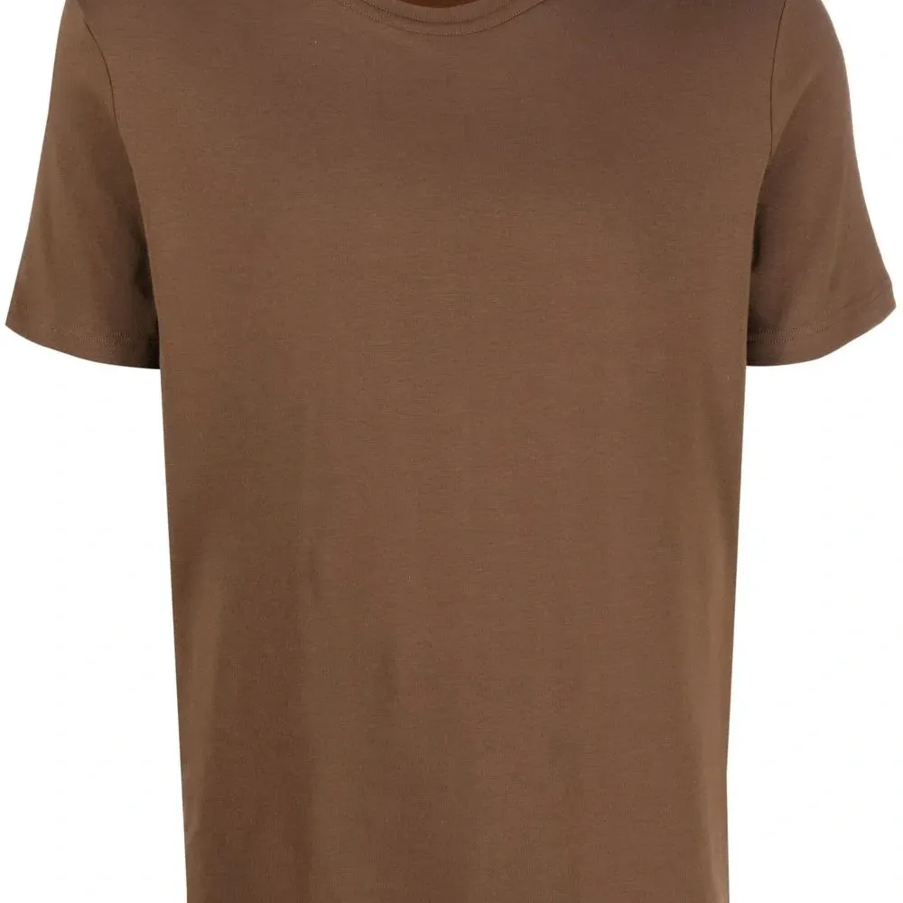 Коричневый, эластичный хлопок, круглый вырез, короткие рукава и прямой подол.