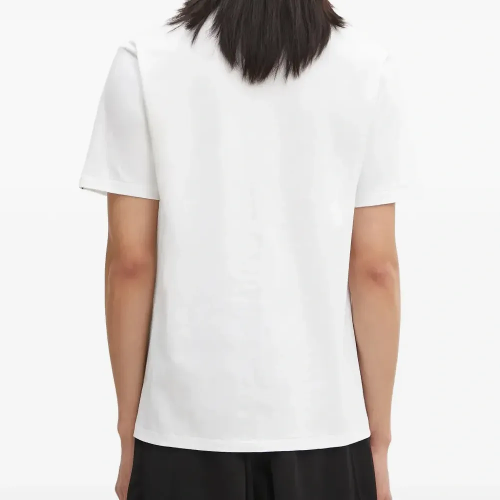 белая футболка с принтом логотипа спереди, круглым вырезом и короткими рукавами