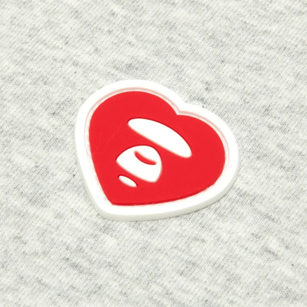светло-серое хлопковое изделие с аппликацией в виде сердца, круглым вырезом и логотипом на спине
