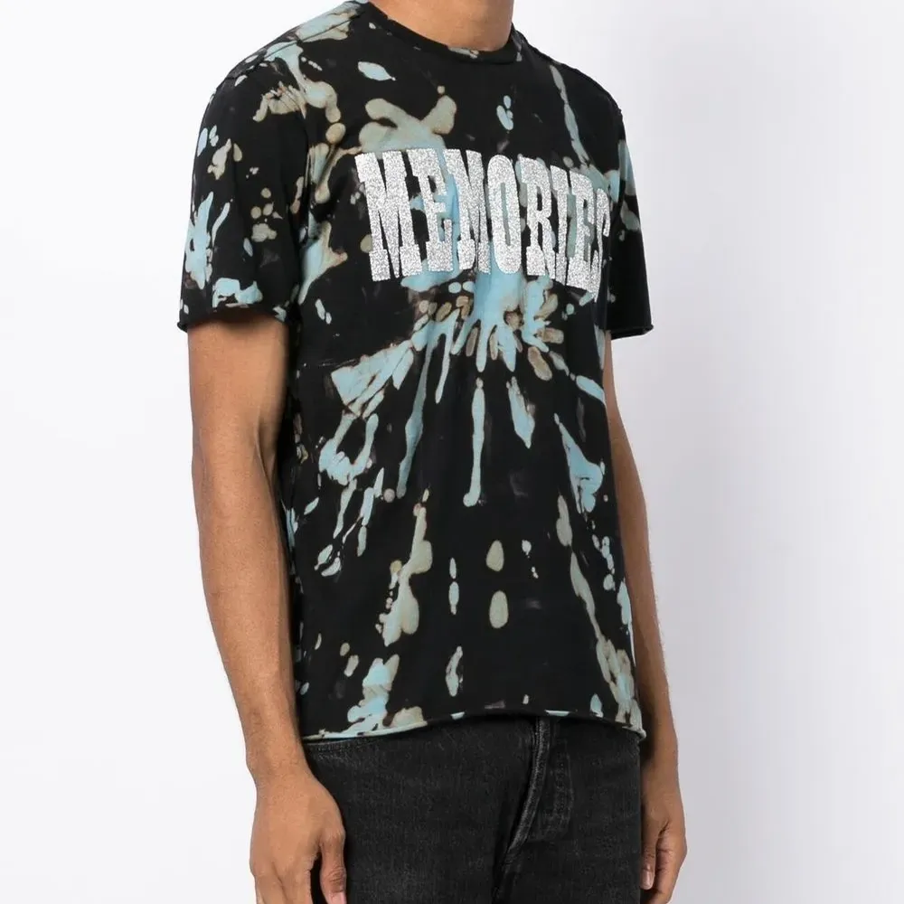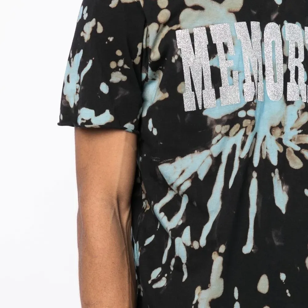 Черный/разноцветный, хлопок, эффект обесцвечивания, принт с надписью спереди, блестящий материал, круглый вырез, короткие рукава и необработанные края.