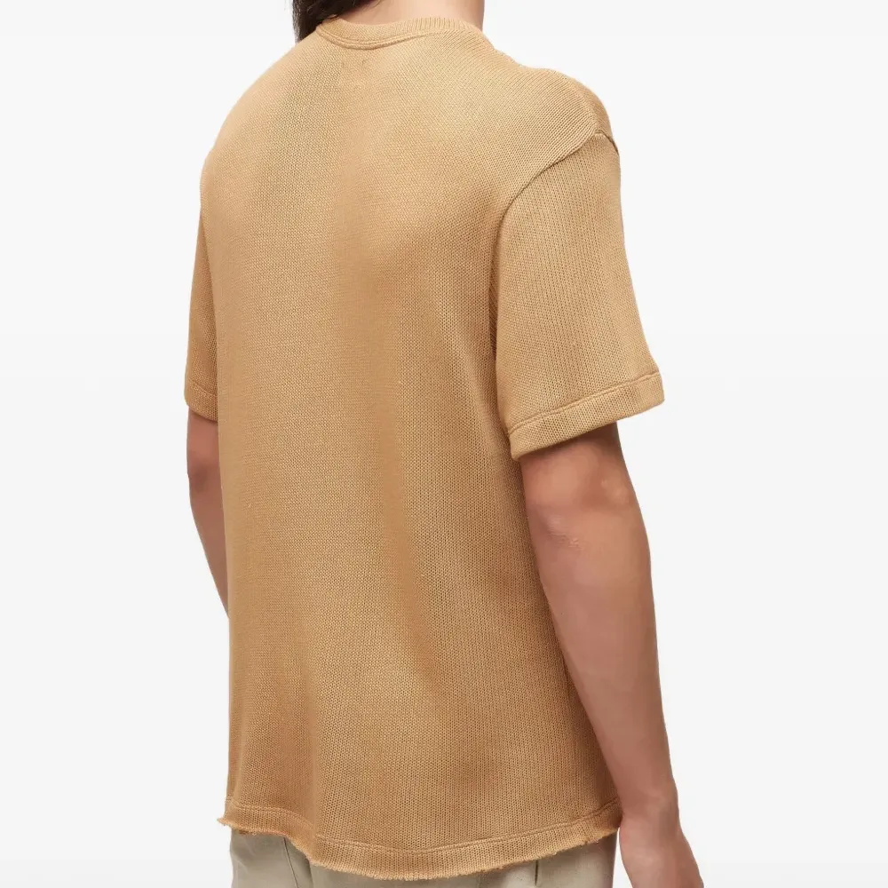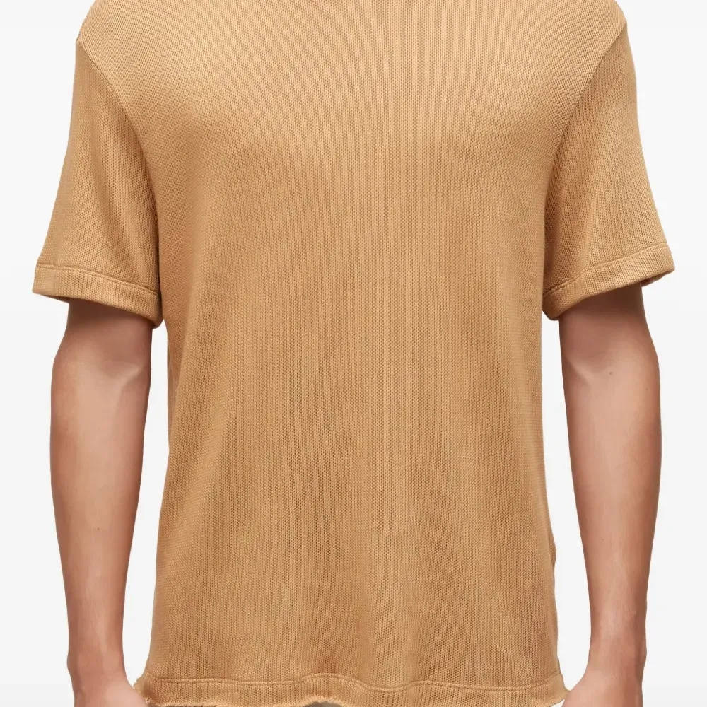светло-коричневые футболка с короткими рукавами, круглым вырезом и необработанными краями
