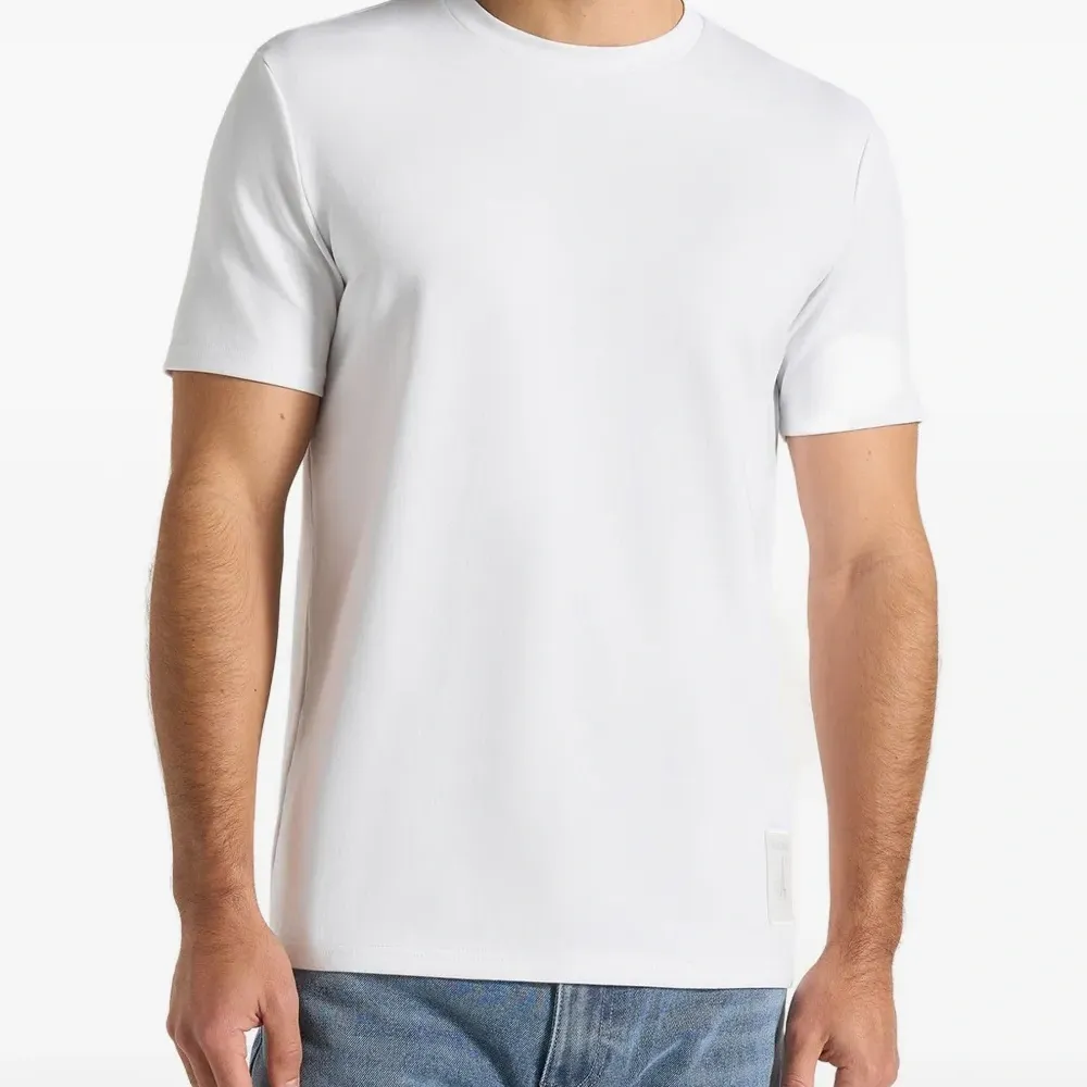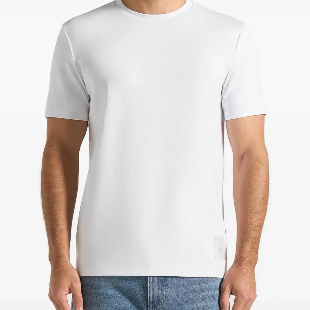 белая футболка с круглым вырезом, короткими рукавами и нашивкой с логотипом