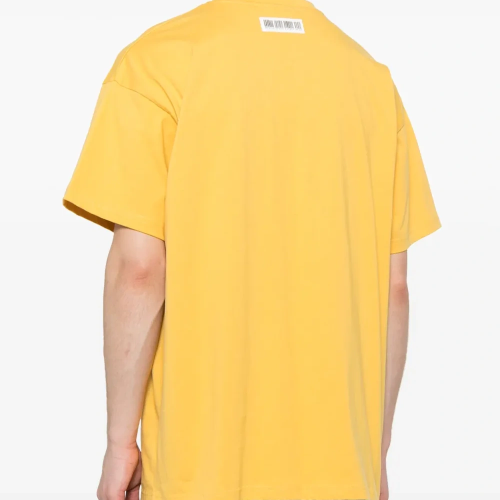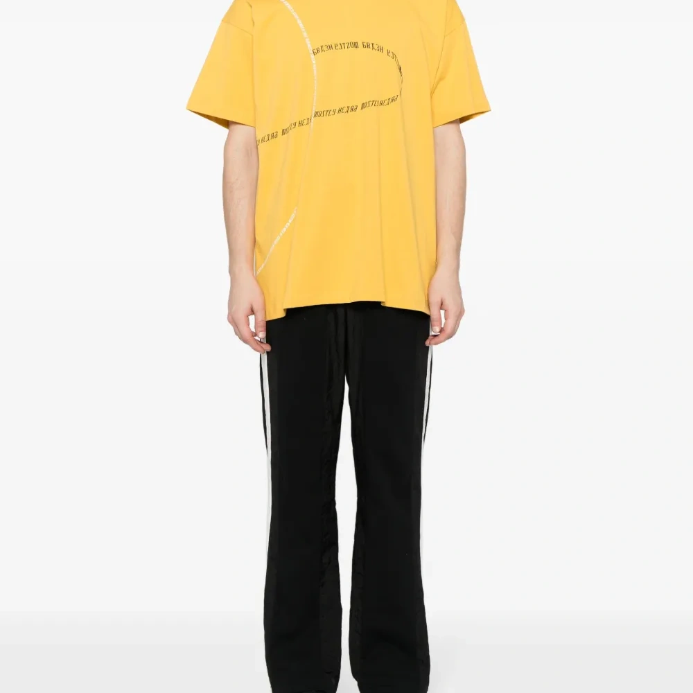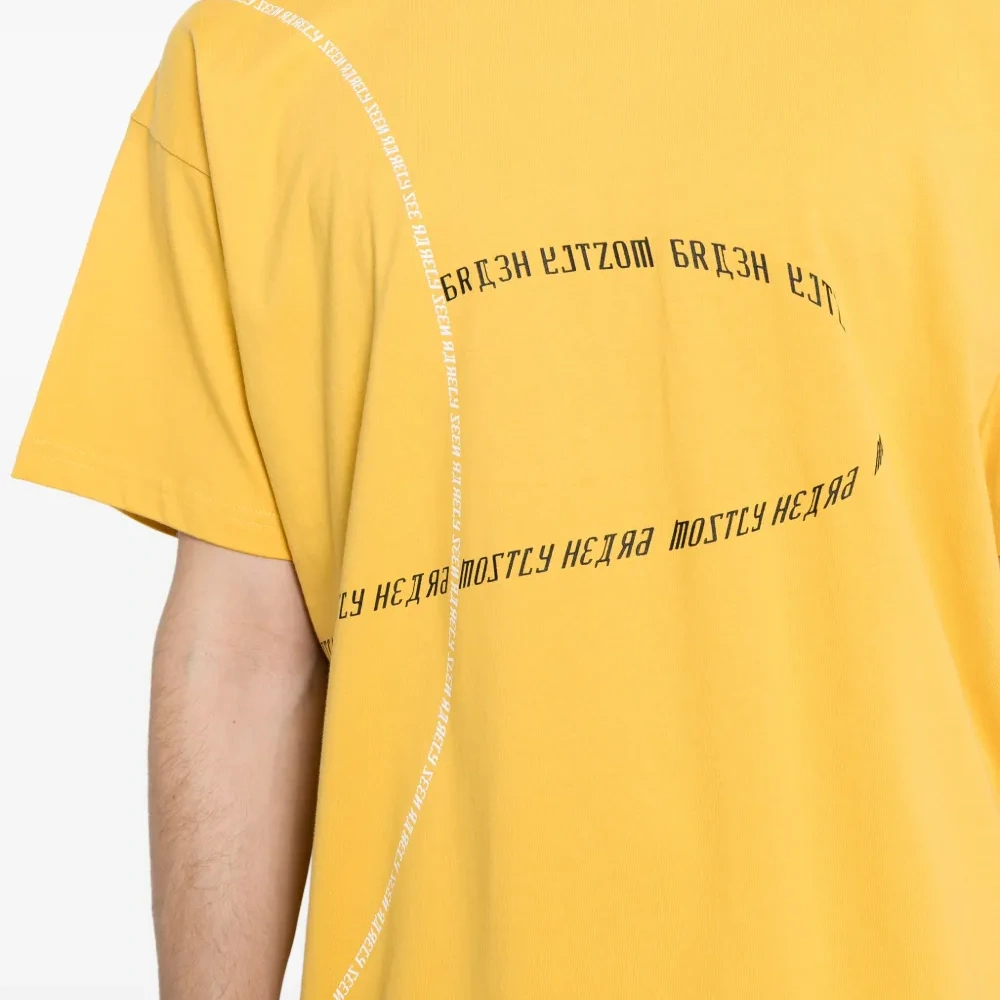 Ярко-желтый, хлопок, принт с надписью спереди, круглый вырез, приспущенные плечи, короткие рукава и прямой подол.