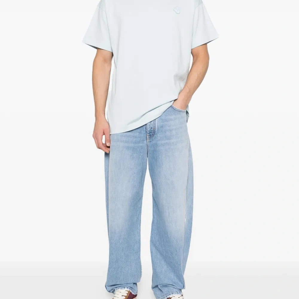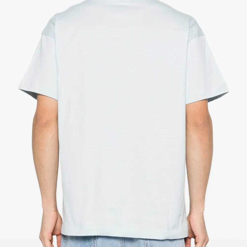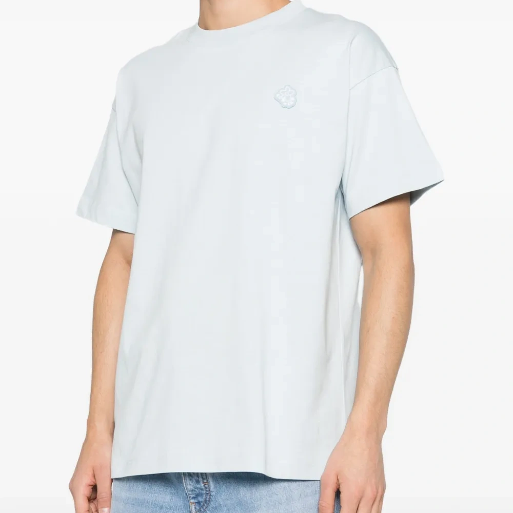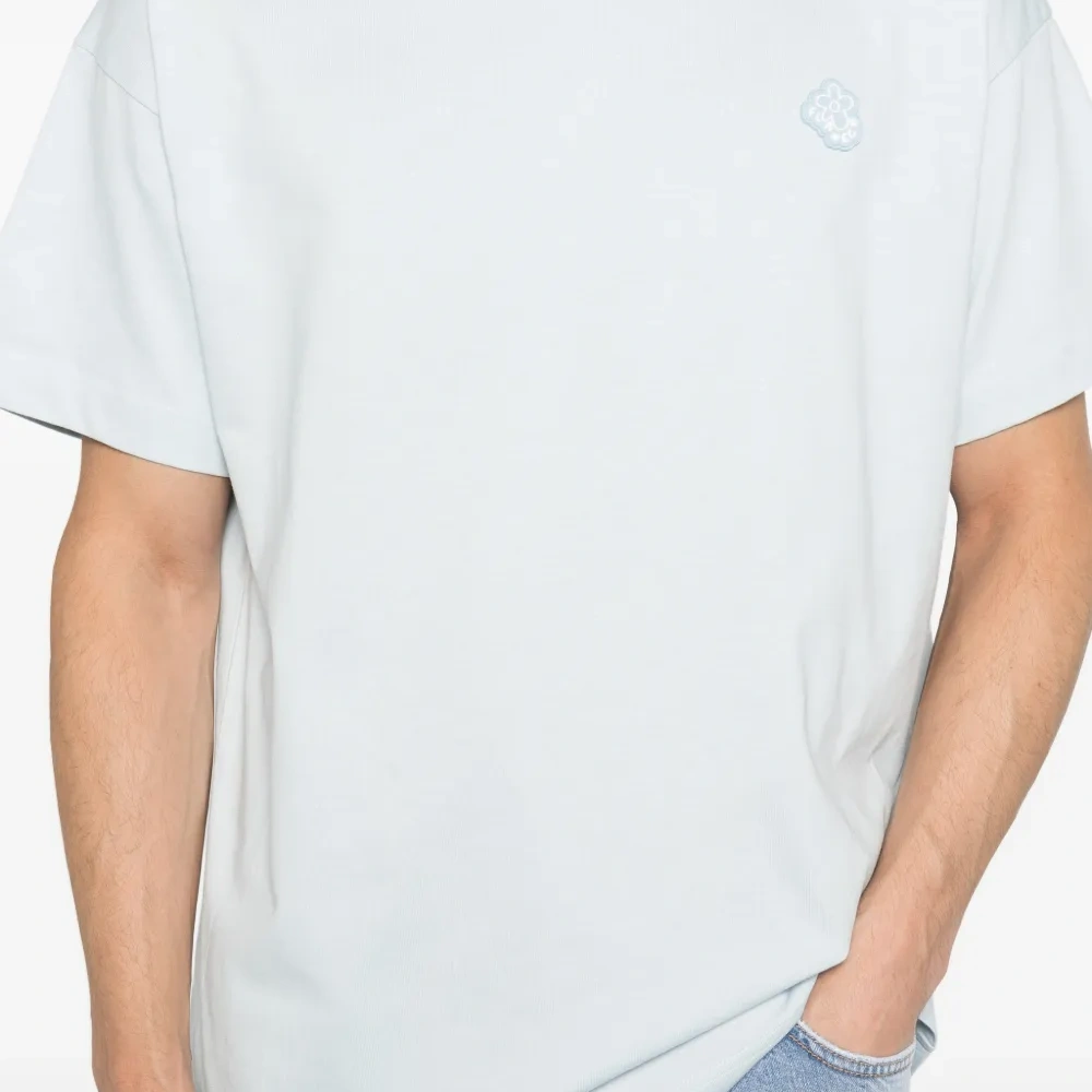 светло-голубая футболка с круглым вырезом, короткими рукавами и нашивкой с логотипом