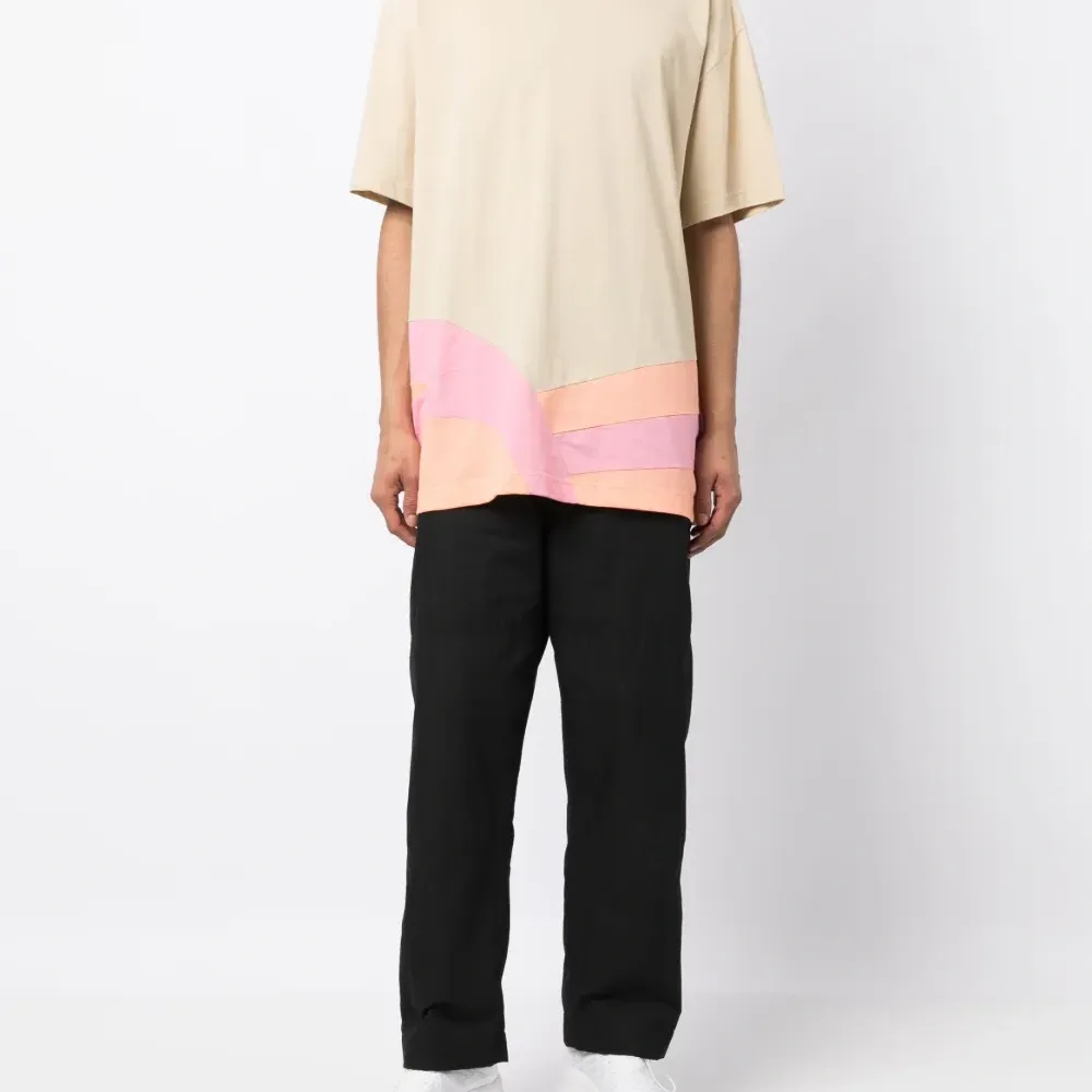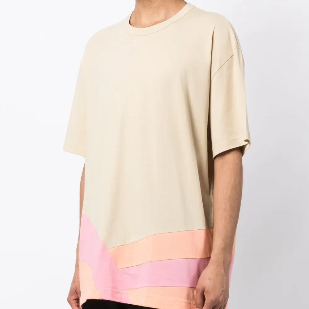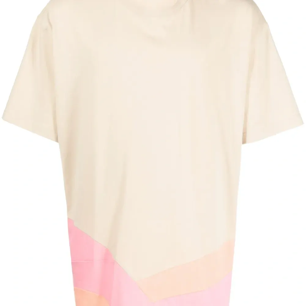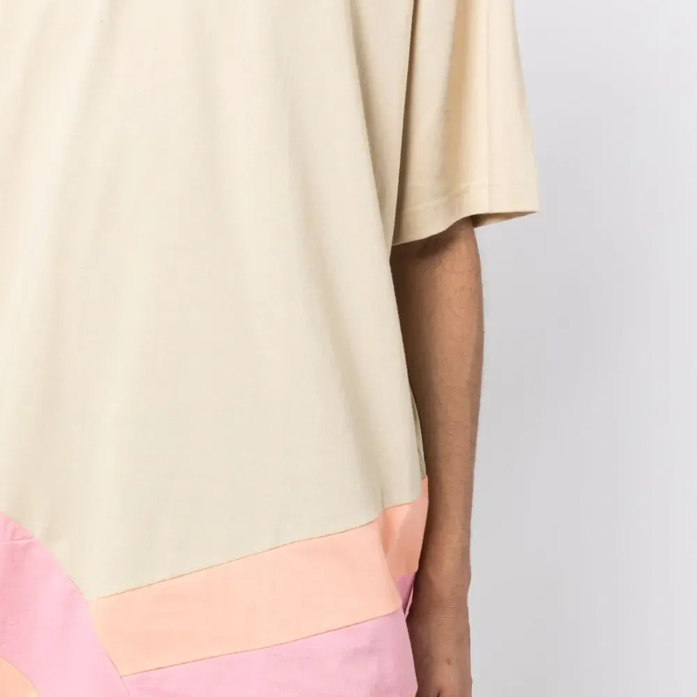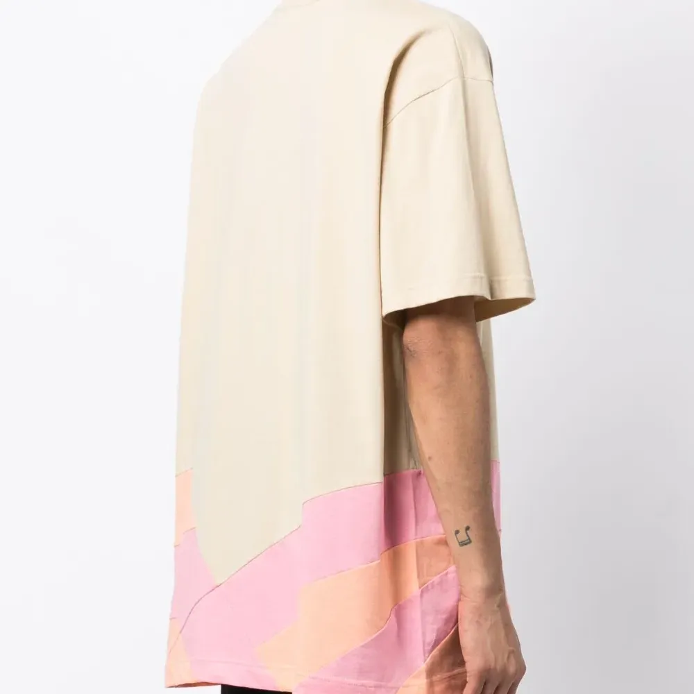 Светло-бежевый, разноцветный, хлопок, графичный принт спереди, круглый вырез, короткие рукава и прямой подол.