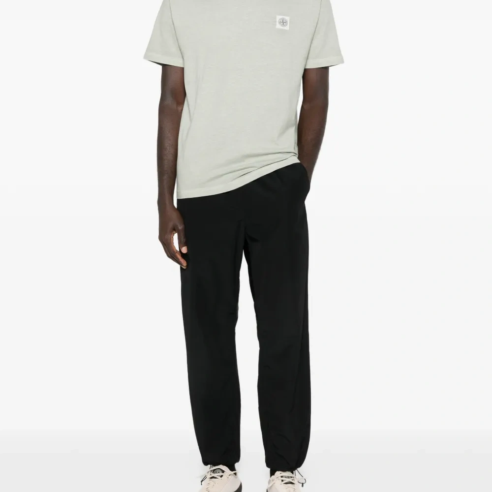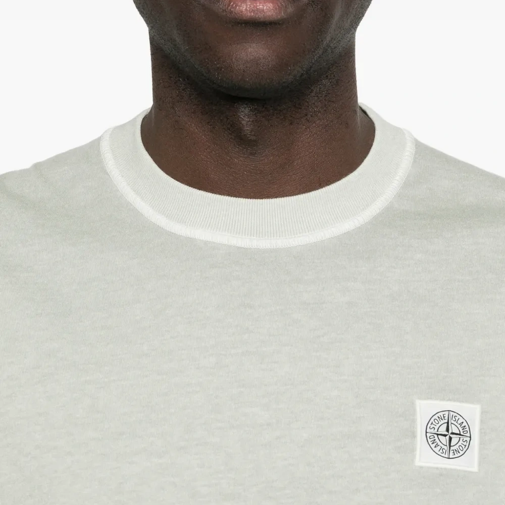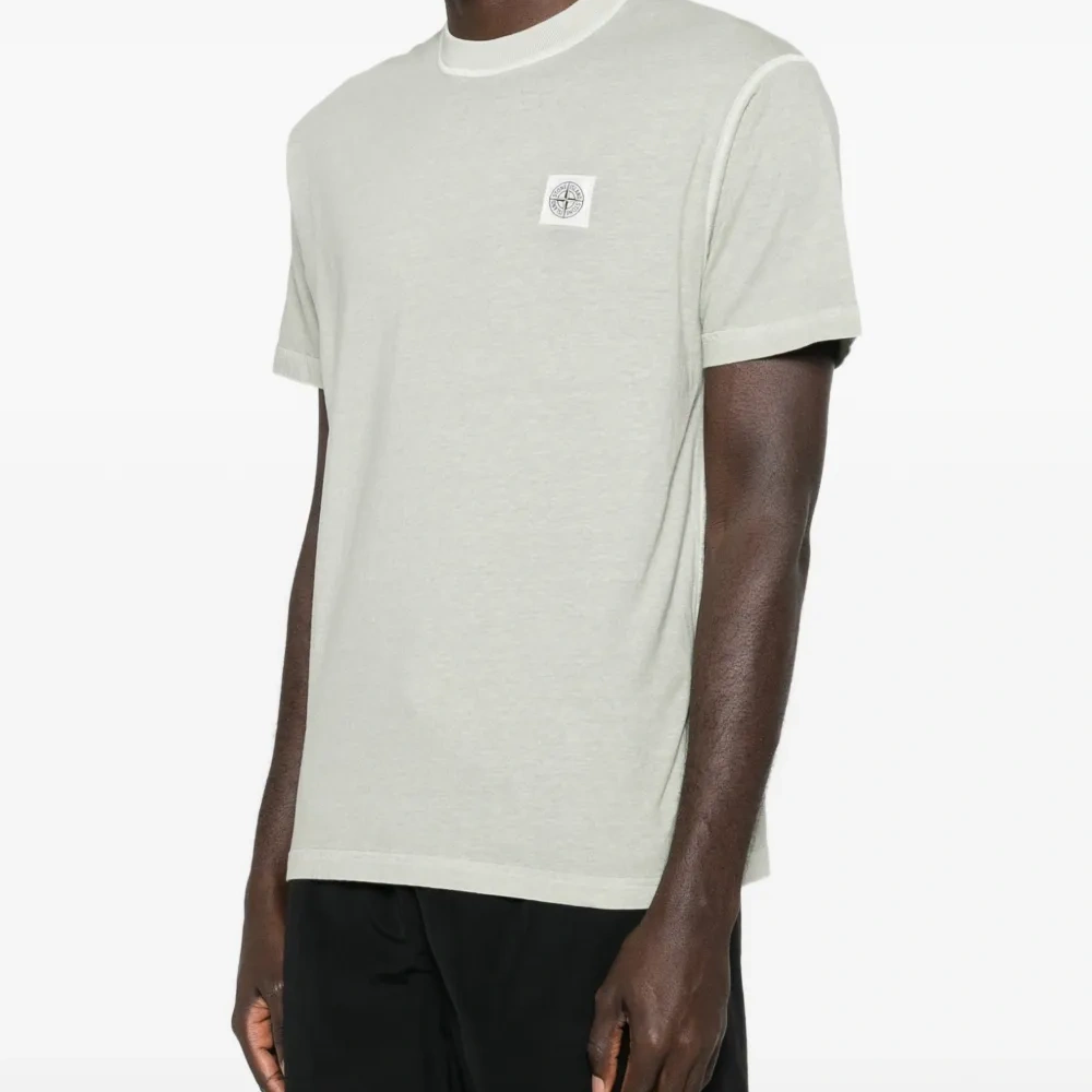 светло-зеленая футболка с круглым вырезом, короткими рукавами и нашивкой с логотипом