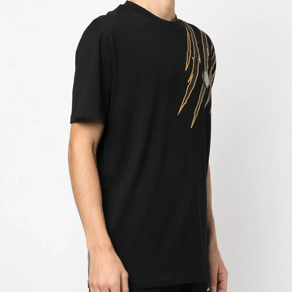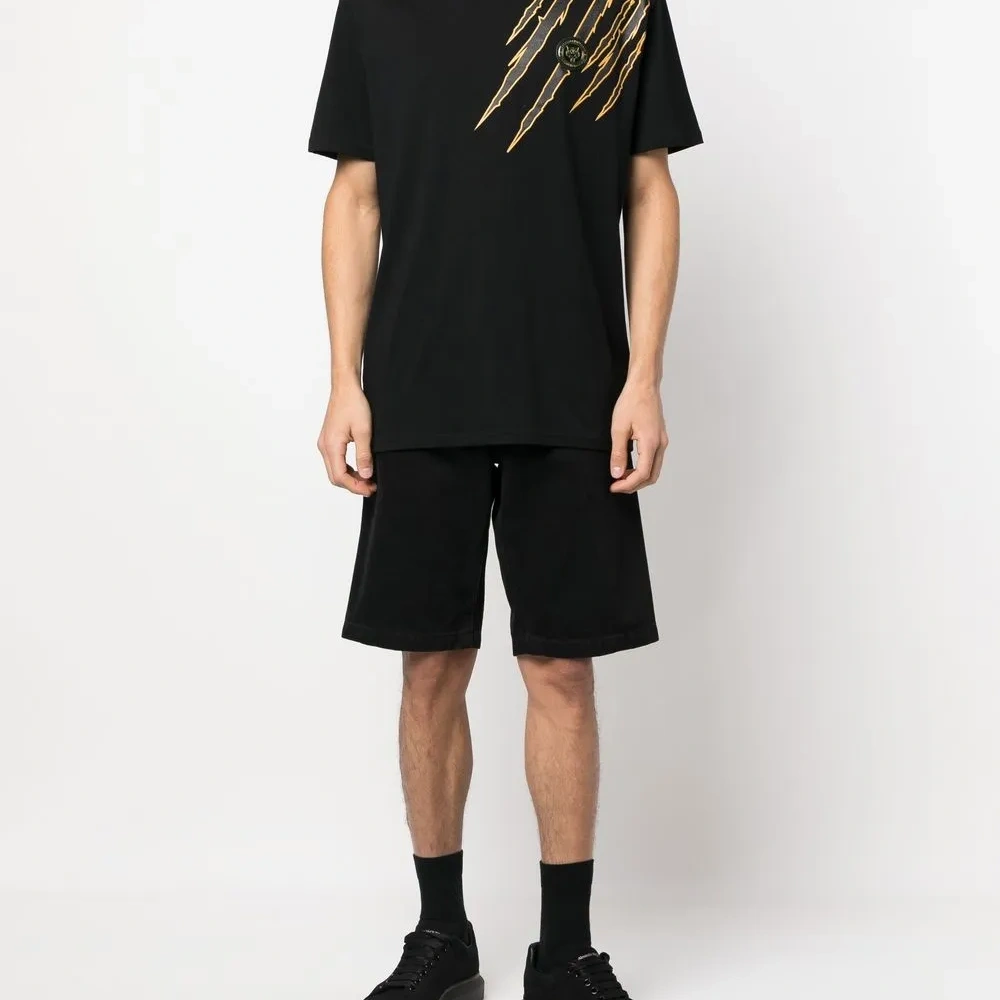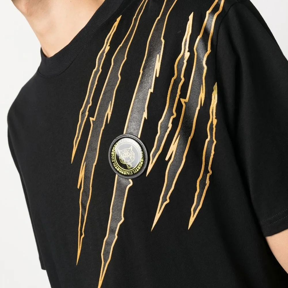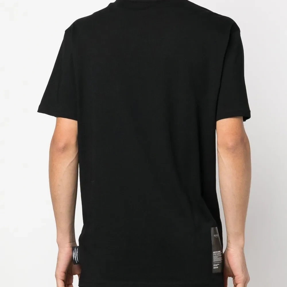 Ткань джерси, нашивка с логотипом на груди, круглый вырез, короткие рукава и прямой подол.