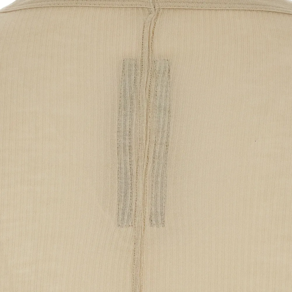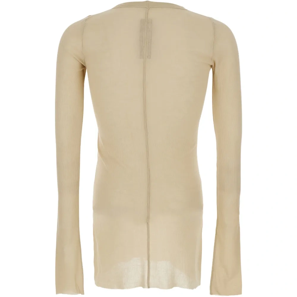 бежевый тонкий вязаный джемпер с длинными рукавами, необработанным краем и круглым вырезом