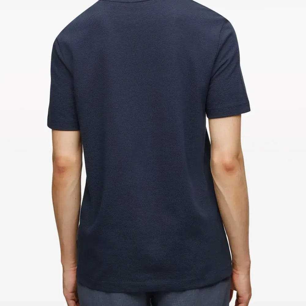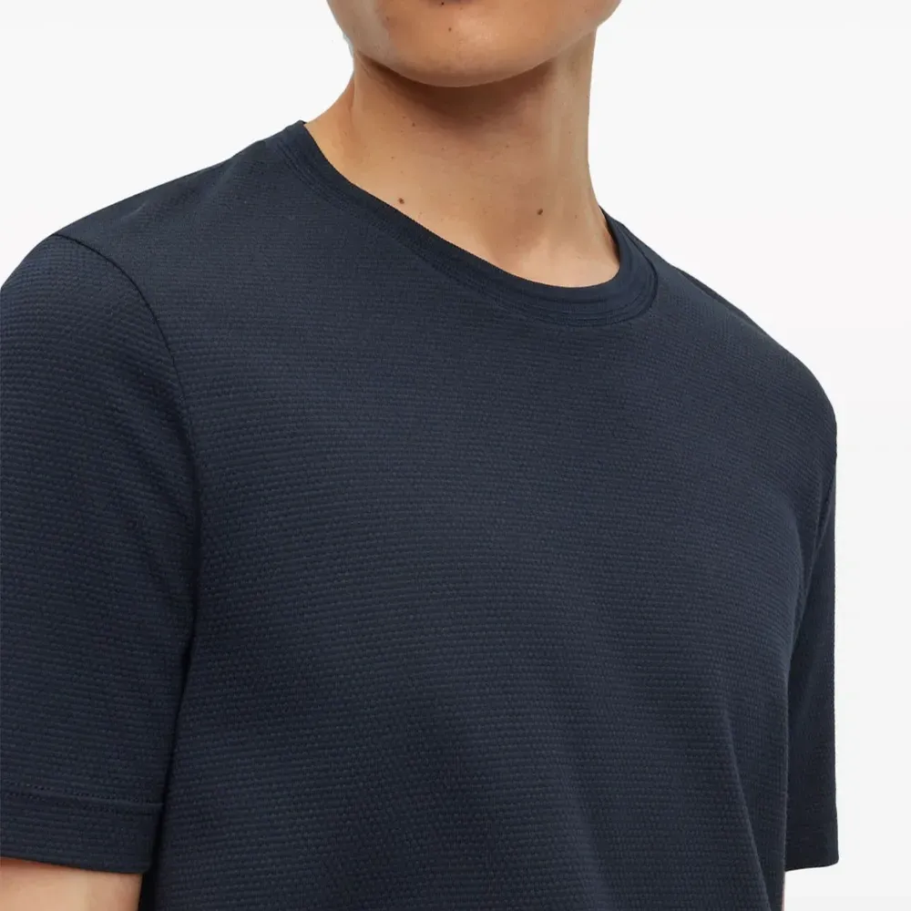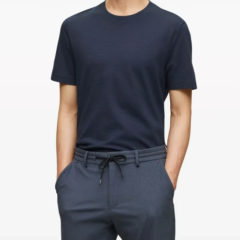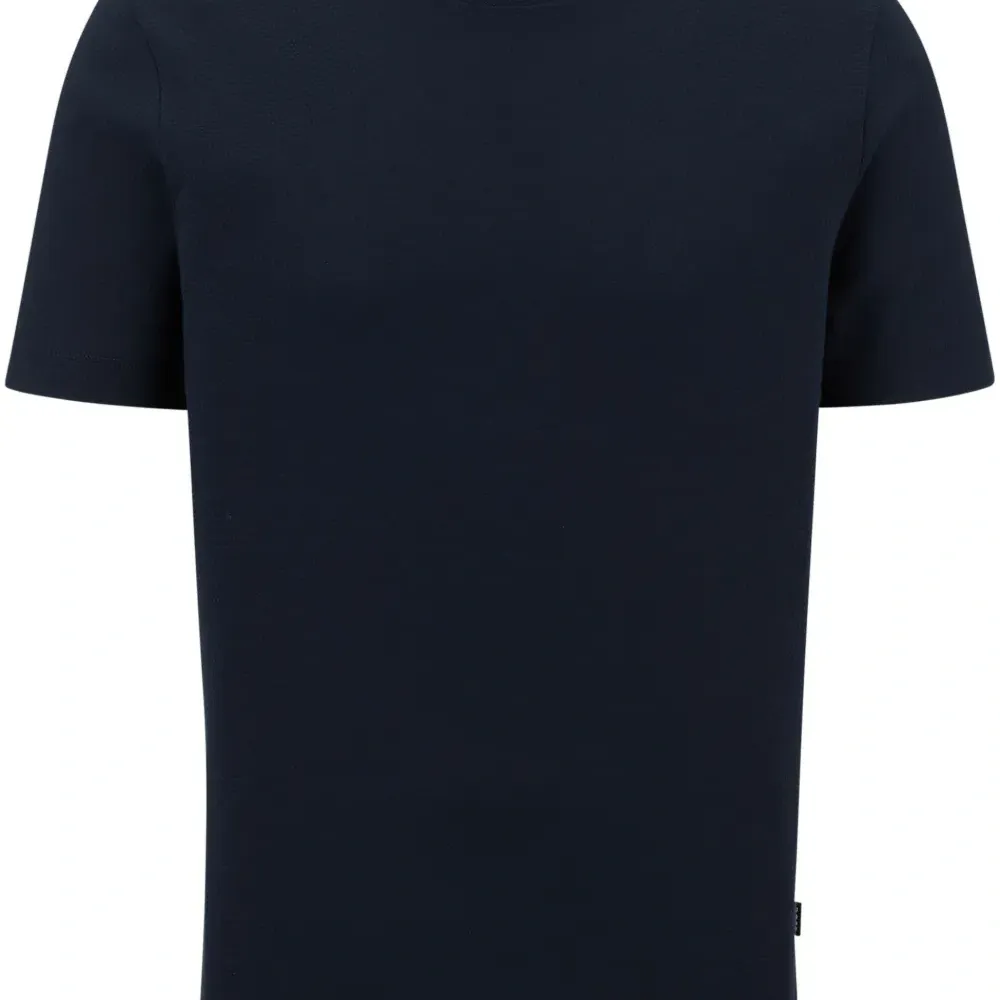 Темно-синий, хлопок, ткань джерси, жаккардовая модель, круглый вырез, короткие рукава, прямой подол и бирка с логотипом.