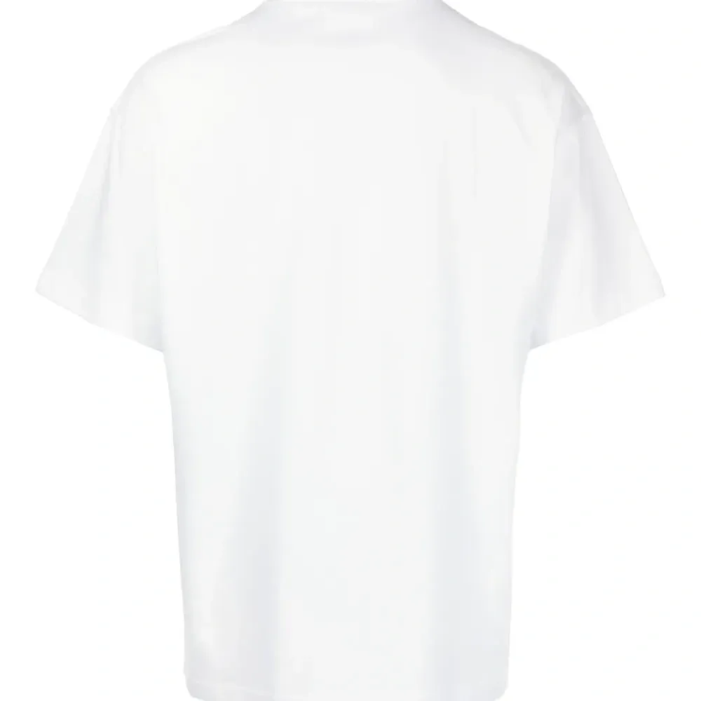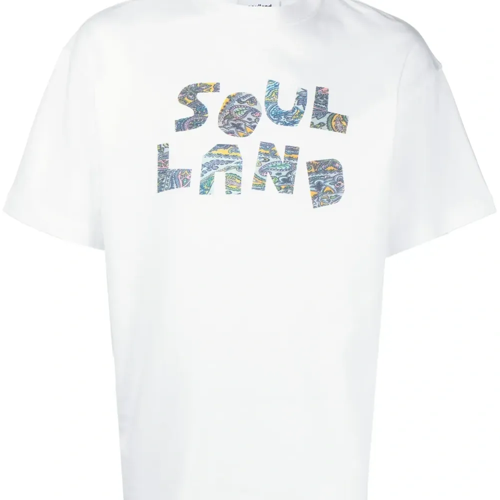 Белый, органический хлопок, принт пейсли, логотип спереди, круглый вырез, короткие рукава и прямой подол.