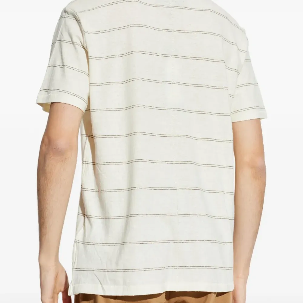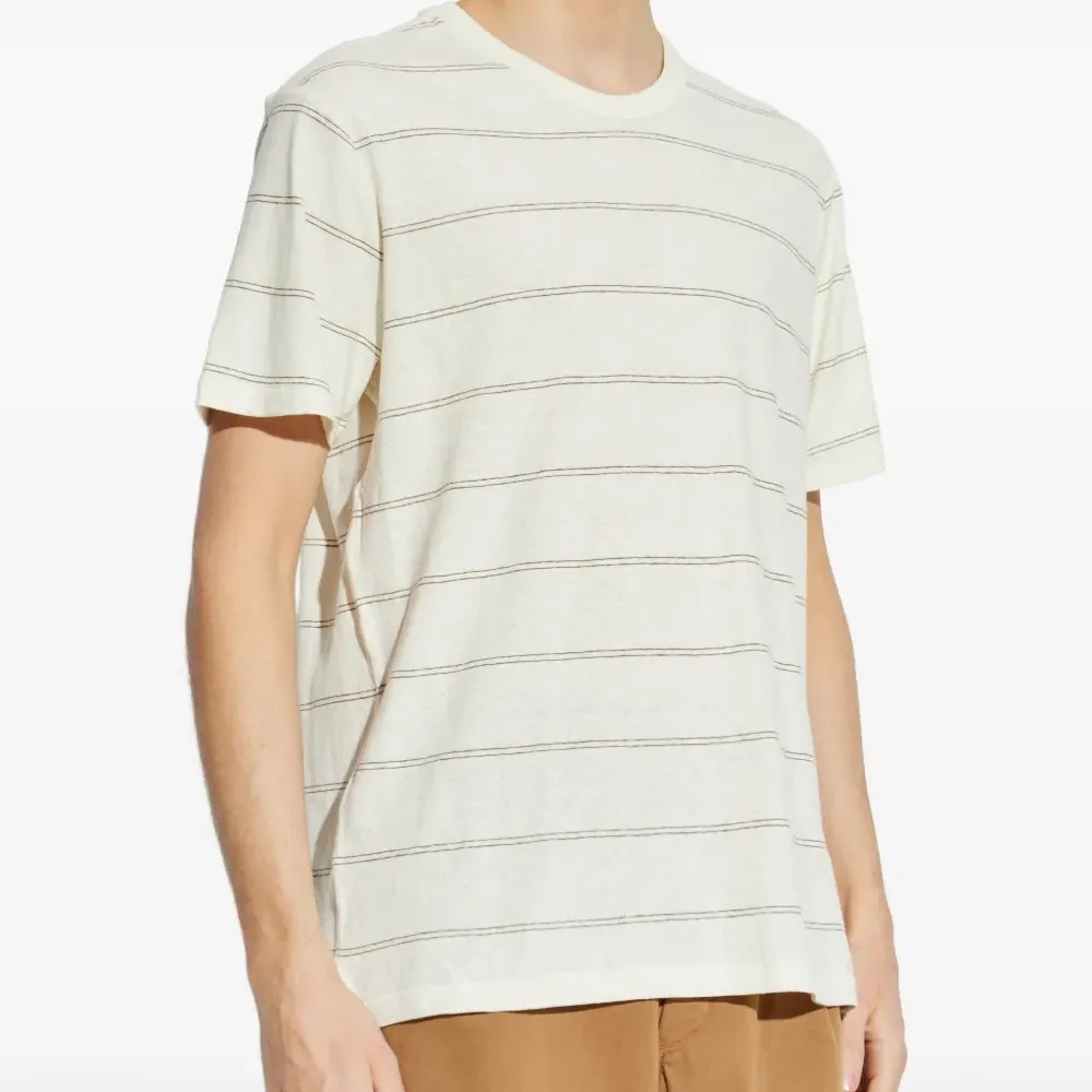 белая футболка в полоску с короткими рукавами, круглым вырезом и разрезами по бокам